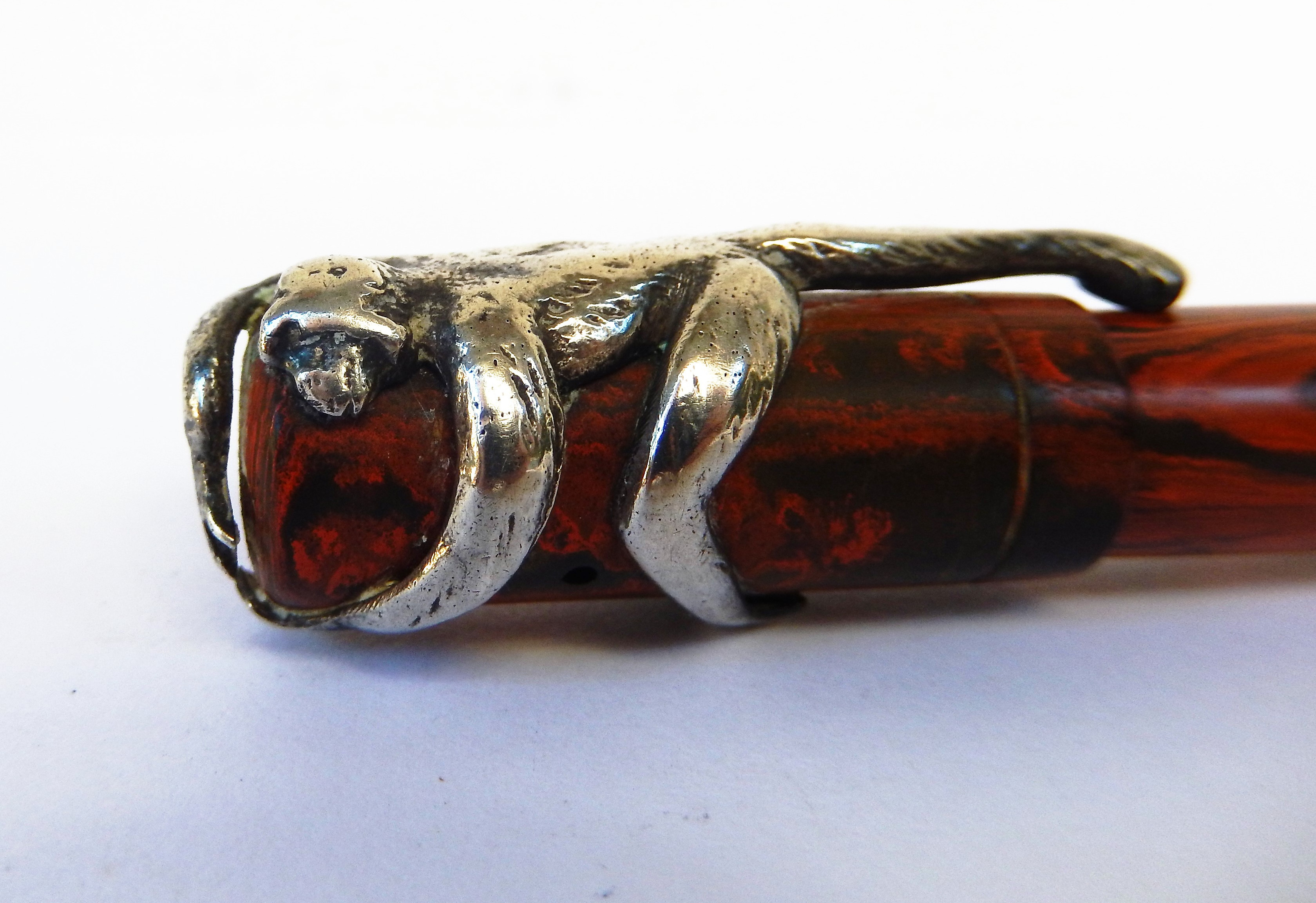 Foto di una penna Waterman. Modello: Waterman 42½V. Caricamento rientrante. Realizzazione in ebanite fiammata. Dettaglio del cappuccio. Dettaglio della clip di comodo. Con una particolare accommodation clip a forma di scimmia. Contributo di Luigi (utente forum lucre).