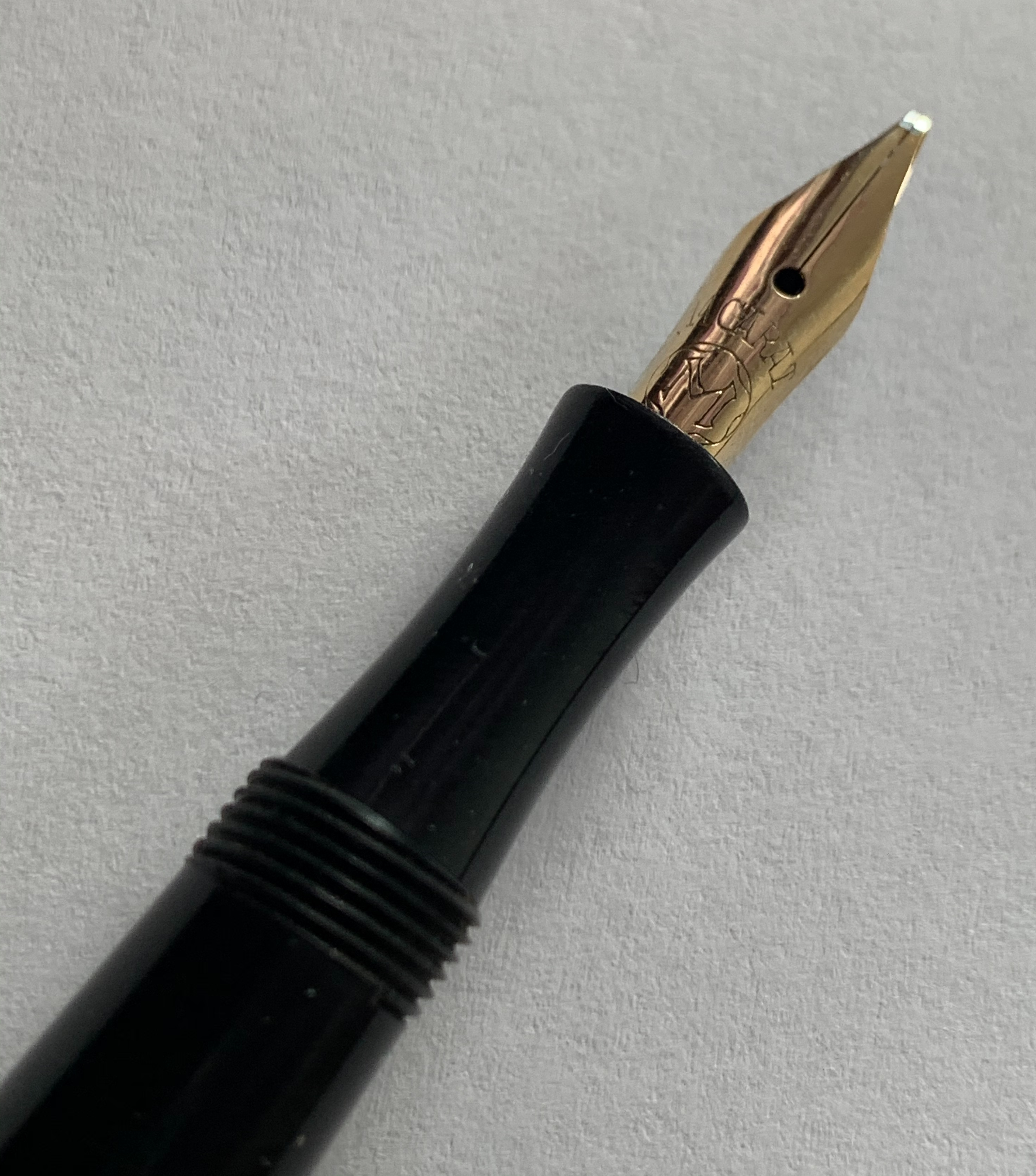 Foto di una penna Montblanc. Modello: Montblanc No. 2. Caricamento pneumatico. Realizzazione in ebanite nera. Dettaglio del pennino. Versione con caricamento Compressor. Riporta stampigliato il numero del brevetto (nº DE-400356). Contributo di Amedeo (utente forum solido).