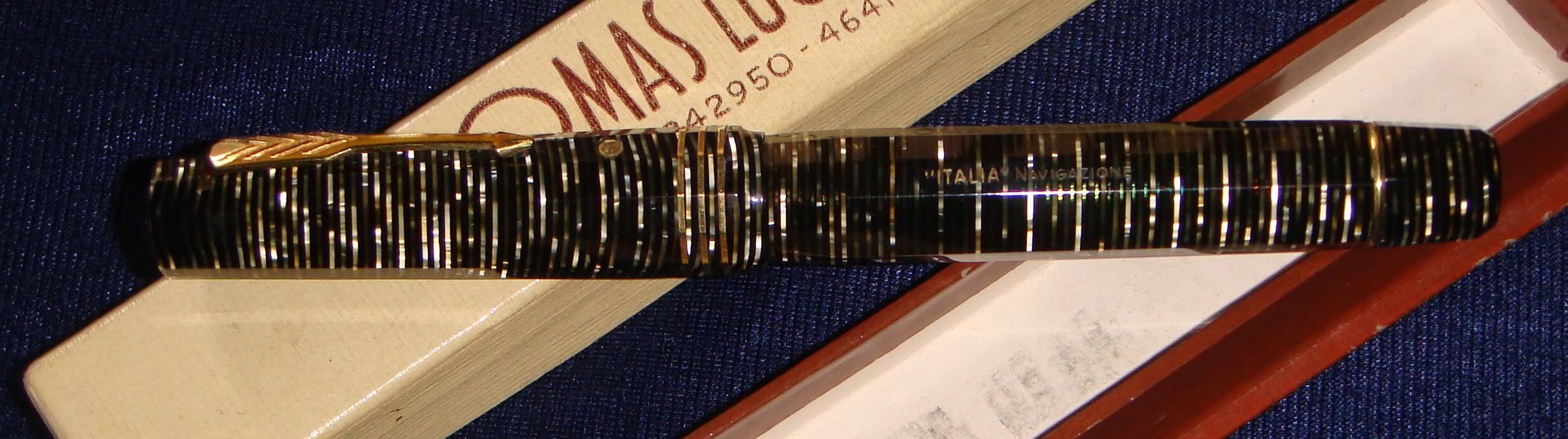 Foto di una [[Omas]] modello [[Extra Lucens]], in [[celluloide]] anellata con scatola originale, marcata ''"Italia" Navigazione''. | Foto di una [[Omas]] modello [[Extra Lucens]], in [[celluloide]] anellata con scatola originale, marcata ''"Italia" Navigazione''. | ||