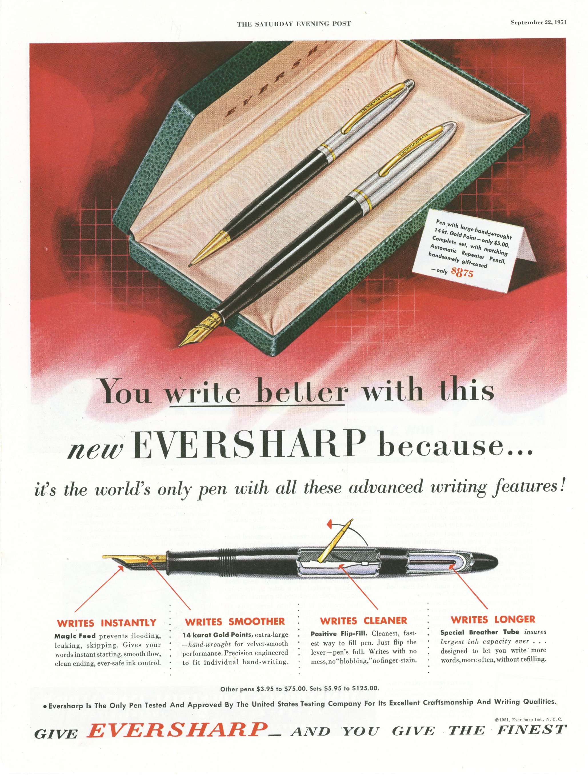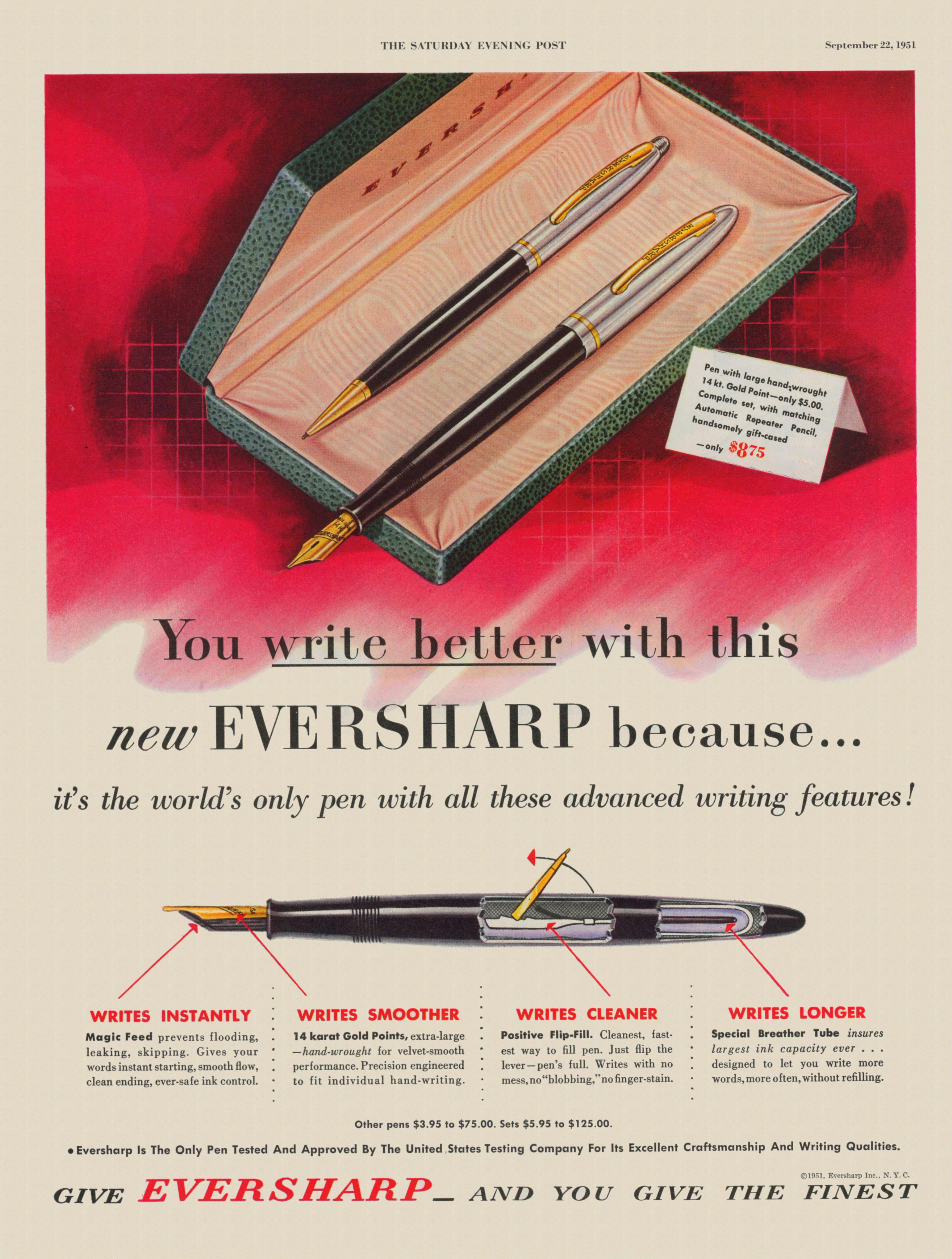 Scansione di una pubblicità [[Eversharp]] [[Category:<ul><li>Il simbolo “[[” ` stato usato in un punto in cui è inutile.</li> <!--br--><li>Non è stato possibile comprendere la parte “]]” della query. Il risultato potrebbe essere diverso da quello atteso.</li></ul> Ads]](sottomarca <ul><li>Il simbolo “[[” ` stato usato in un punto in cui è inutile.</li> <!--br--><li>Non è stato possibile comprendere la parte “]]” della query. Il risultato potrebbe essere diverso da quello atteso.</li></ul>) datata 22 settembre 1951. Pubblicazione su: The Saturday Evening Post. Data visibile direttamente. Date directly visible. {{{Note_en}}}