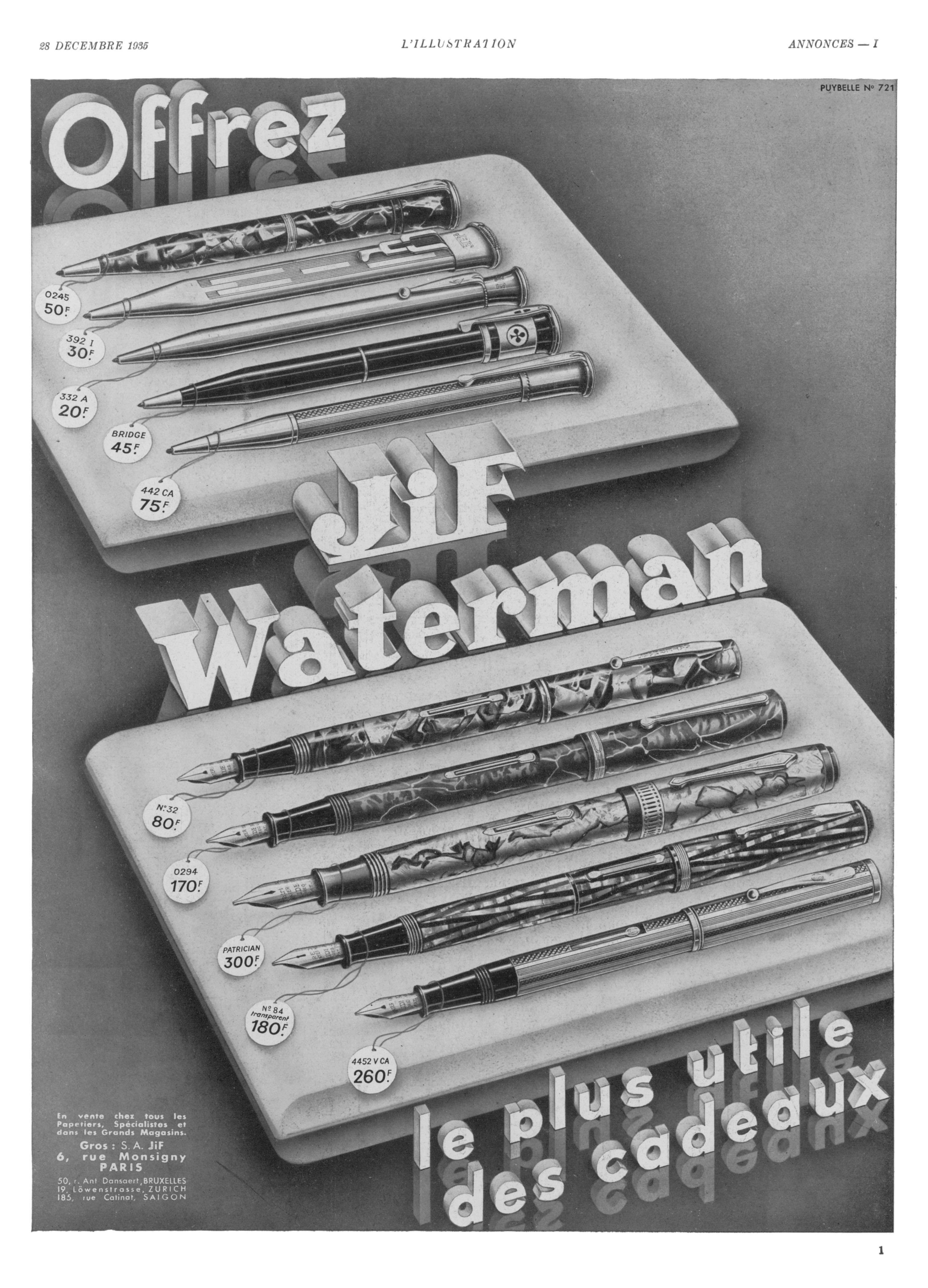 @en|Scanning of a December 28, 1935 [[Waterman]] french advertising for its models. Published on ''L'Illustration''. Retouched by the author for a better sharpness. | @en|Scanning of a December 28, 1935 [[Waterman]] french advertising for its models. Published on ''L'Illustration''. Retouched by the author for a better sharpness. | ||