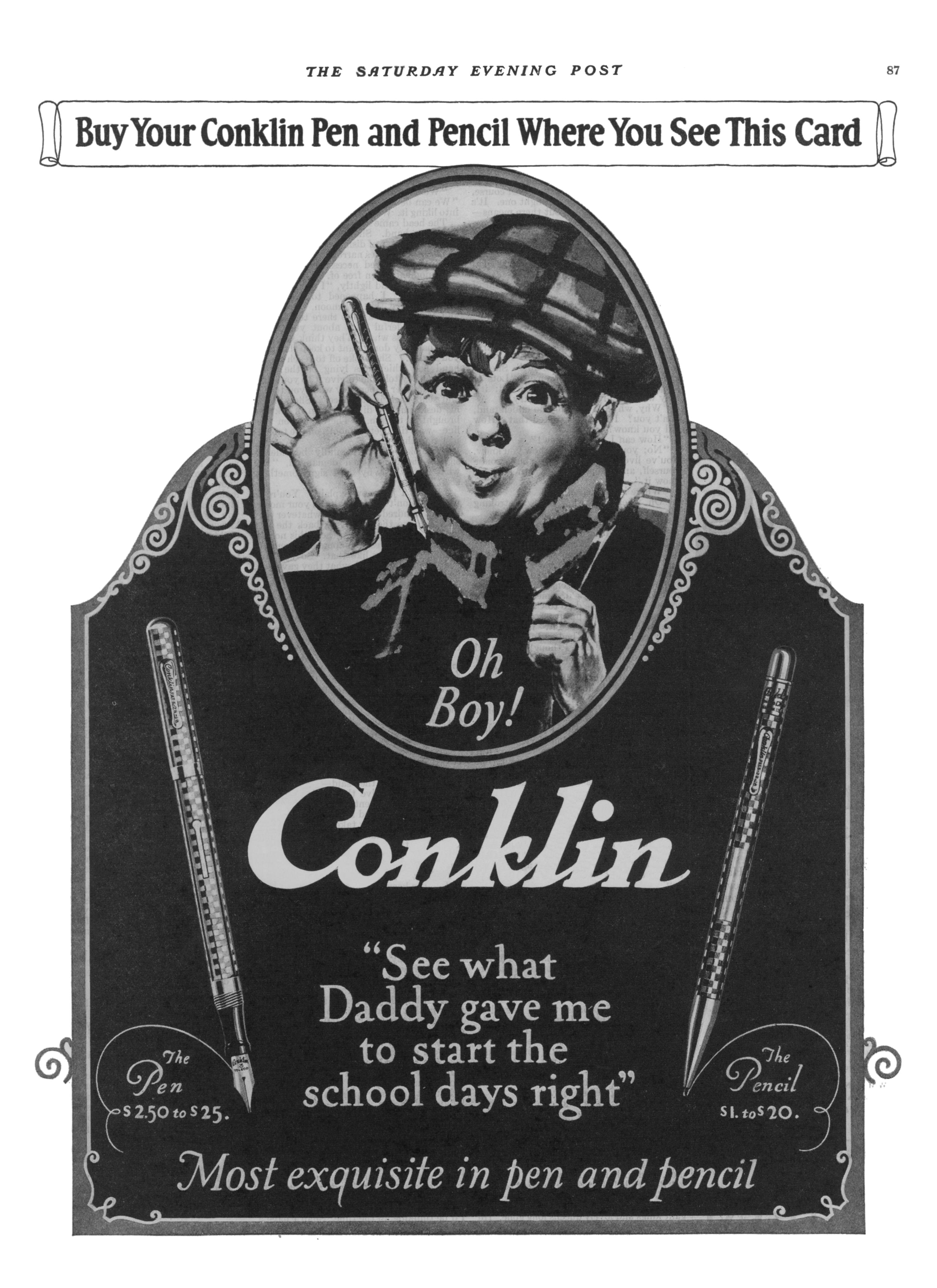 | − | + | |Note_en=Scanning of a September 1, 1923 [[Conklin]] advertising for some models. Published on ''The Saturday Evening Post''. Retouched by the author for a better sharpness. Date on the other side. | |