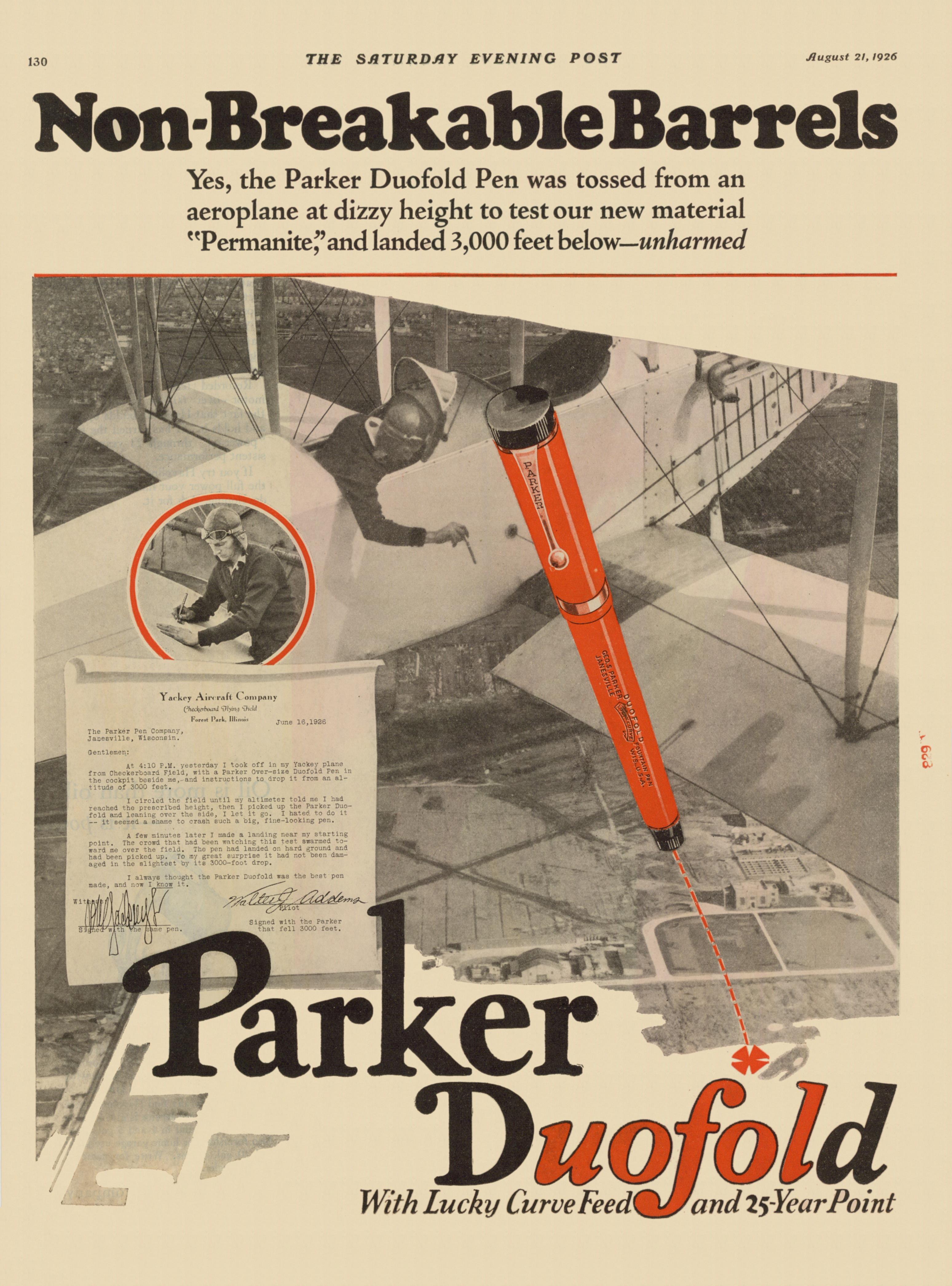 Scansione di una pubblicità Parker datata 21 agosto 1926. Pubblicazione su: The Saturday Evening Post. Ritoccata dall'autore per una migliore nitidezza. Data visibile direttamente. Pubblicizza il modello Duofold, con riferimento al corpo infrangibile in celluloide (denominata Permanite). Pagina sinistra.