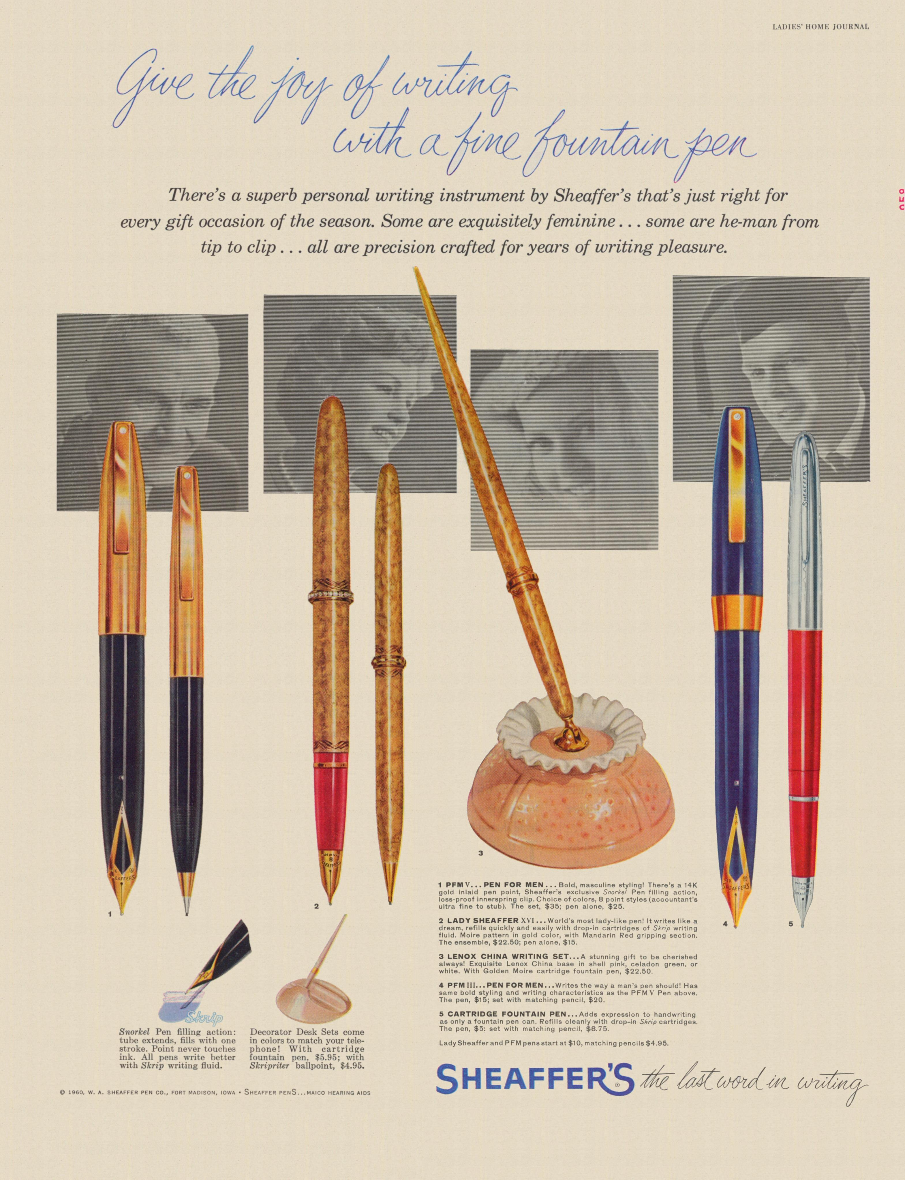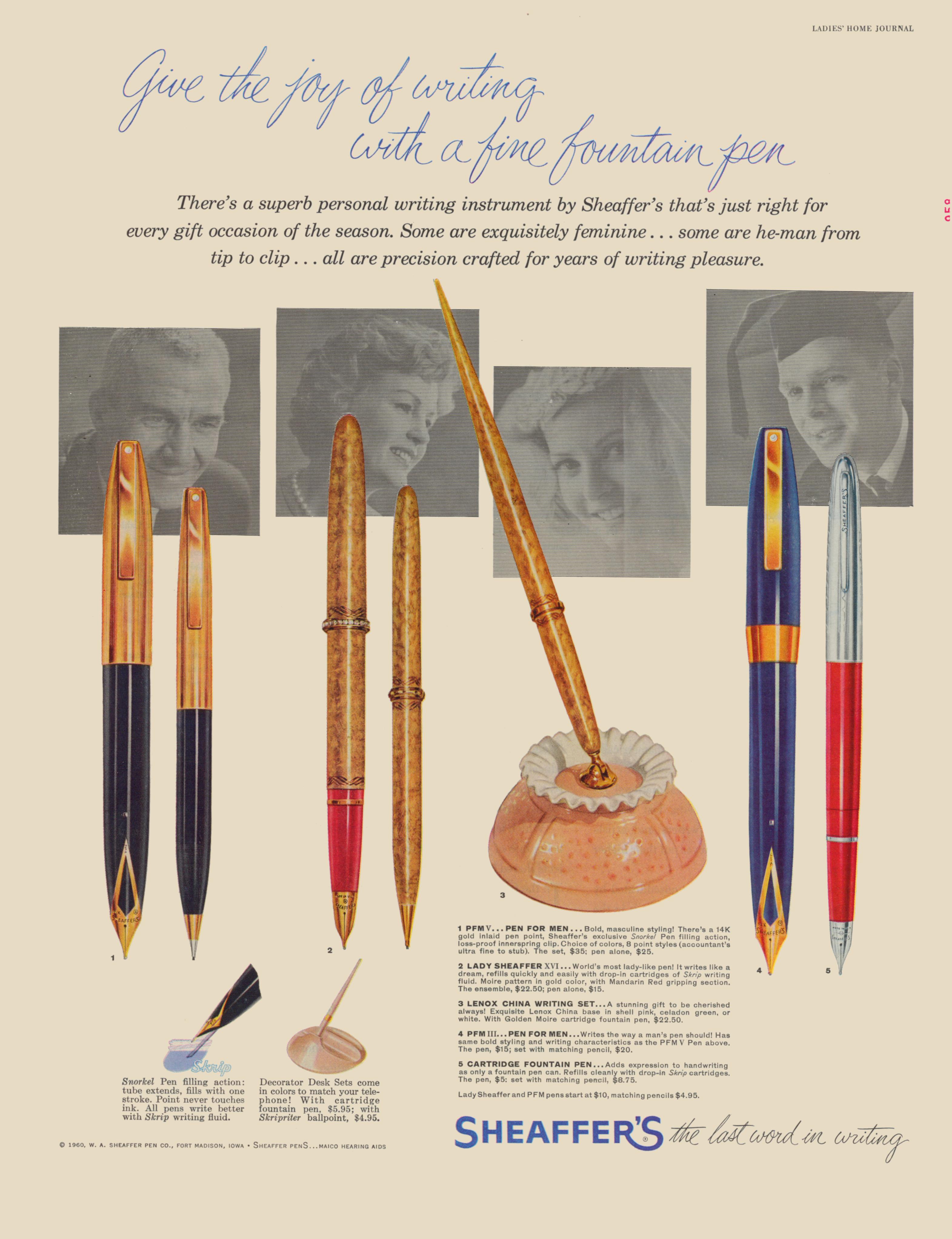 Scansione di una pubblicità Sheaffer datata maggio 1960. Pubblicazione su: Ladies Home Journal. Ritoccata dall'autore per una migliore nitidezza. Data visibile direttamente. Data dalla nota di copyright. Mese da una citazione dell'articolo su retro (It's all the fault of woman di Dorothy Tompson) che viene riferito al numero 77 del maggio 1960 del suddetto giornale. Pubblicizza delle PFM, una Lady Sheaffer e un modello a cartuccia.