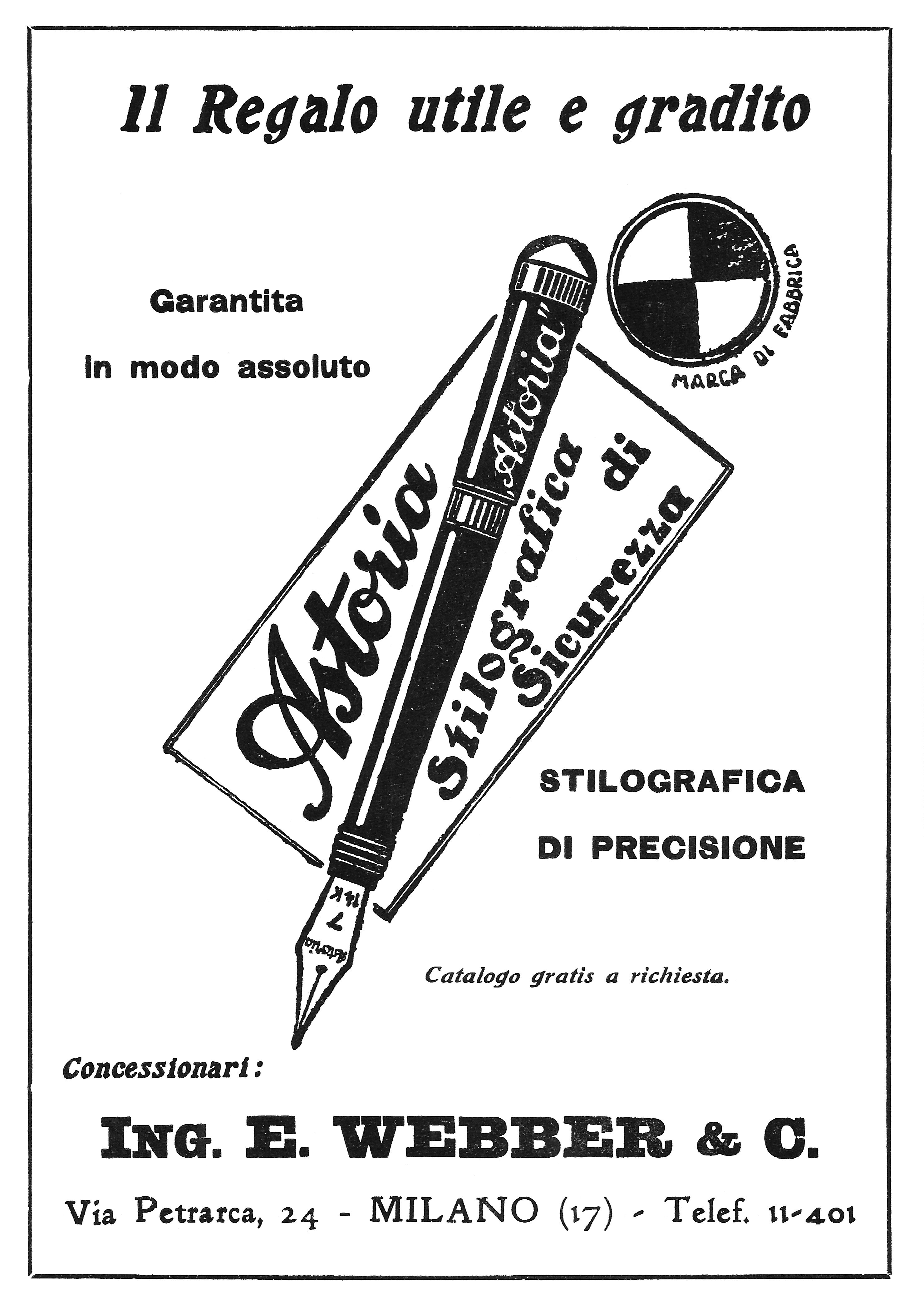Scanning of advertising from Astoria dated 1925-01-18. Published on: L'Illustrazione Italiana. Retouched by the author for a better sharpness. Date directly visible. Year LII, N. 3 and N. 5. Dating given by the provider. Published also on Rivista mensile del Touring Club Italiano - Le vie d'Italia. Advertisement for its safety pens from the Italian reseller E. Webber who registered the trademark in 1924 (Reg. Gen. N. 27562).