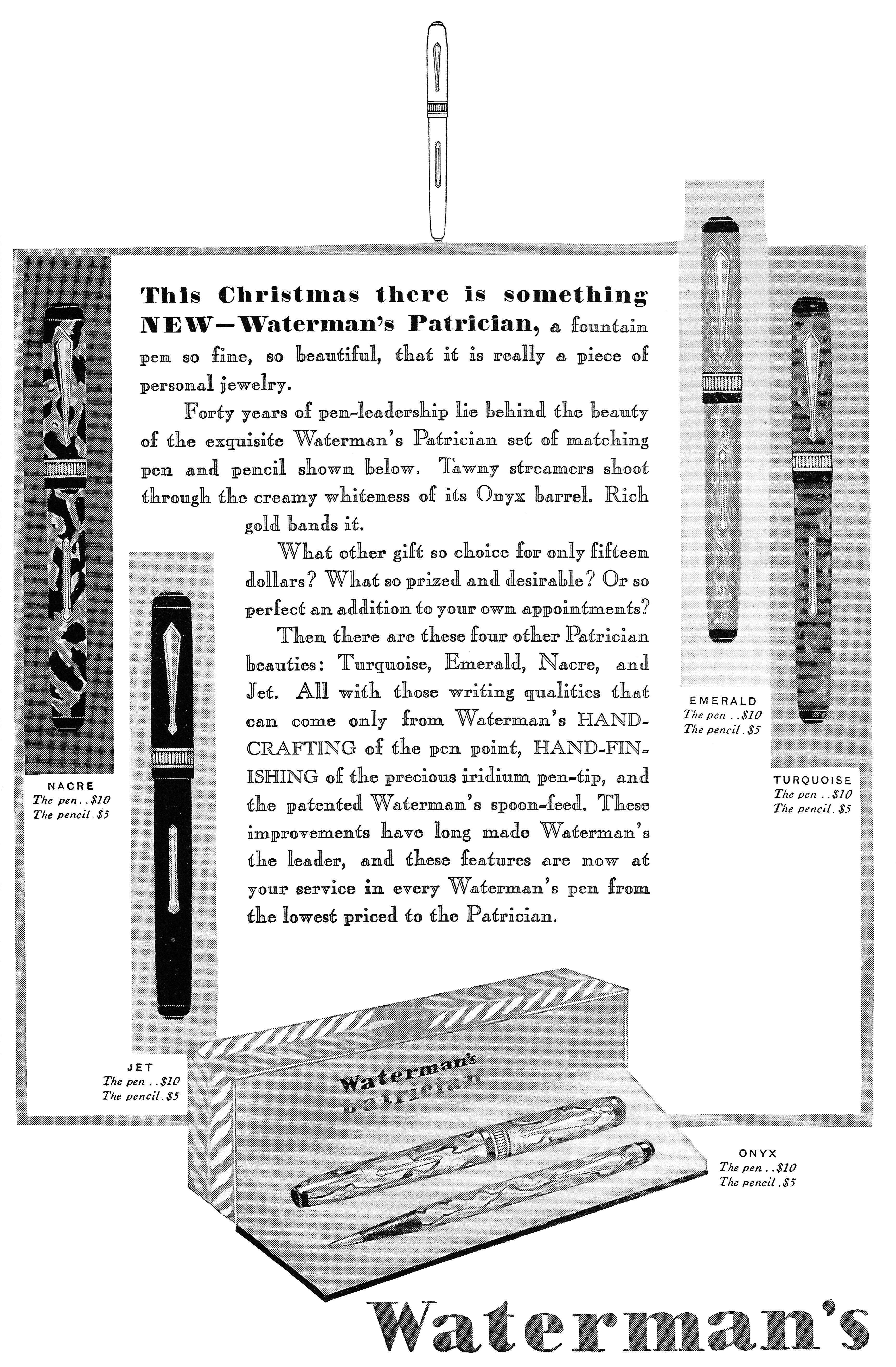 | + | @it|Scansione di una pubblicità [[Waterman]] del 1929 per il lancio della nuova linea di penne [[Patrician]]. Ritoccata dall'autore per una maggiore nitidezza. | ||