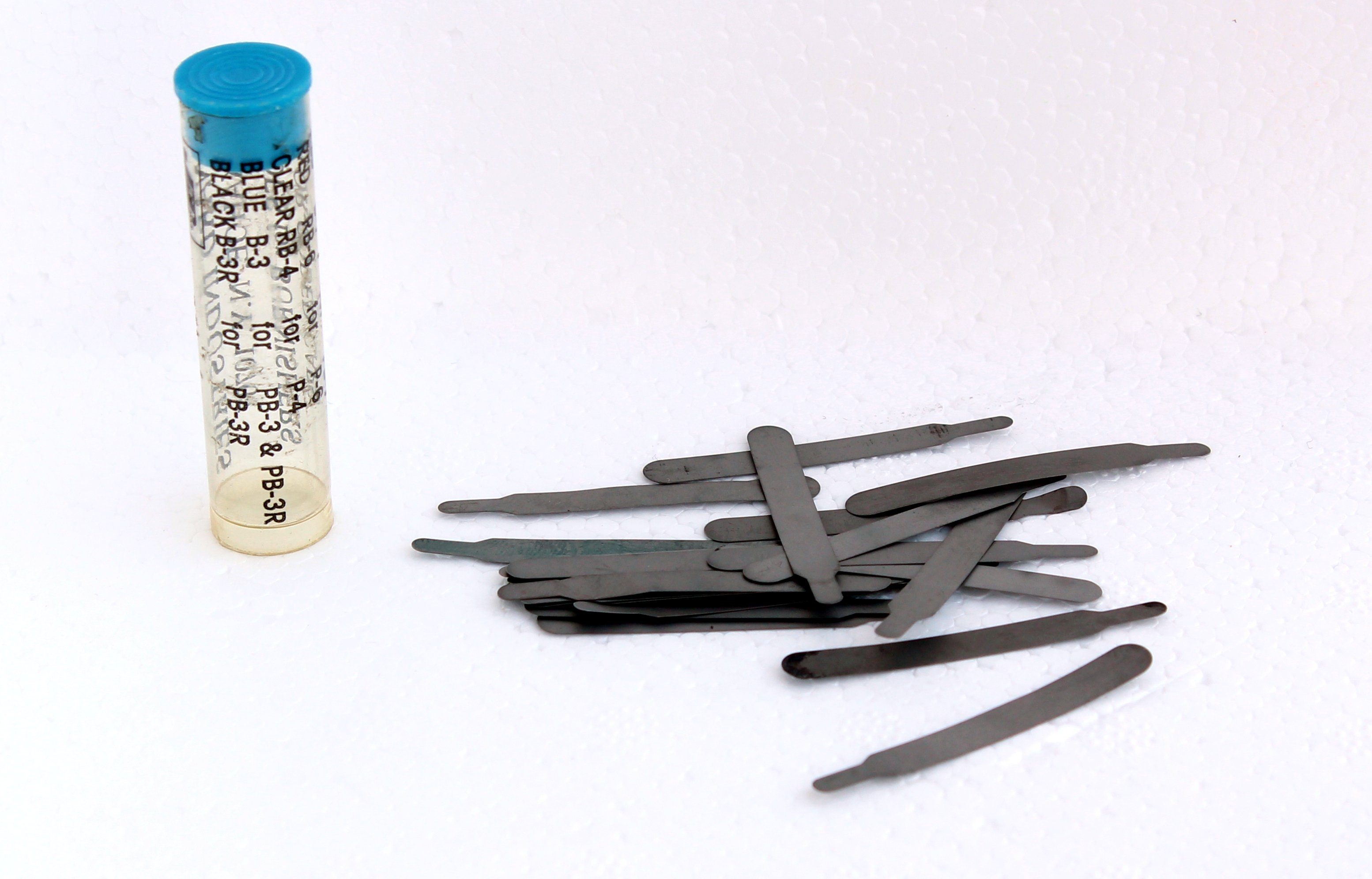 | − | Una serie di spessimetri utilizzabili per divaricare le ali di un pennino, devono essere inseriti a partire dal foro di areazione. | + | Una serie di spessimetri utilizzabili per divaricare le ali di un pennino, devono essere inseriti a partire dal foro di areazione. Si abbia molta cura di verificare che gli spigoli siano lisci, ed in caso contrario si asportino gli eventuali riccioli di taglio con una passata in carta abrasiva. |