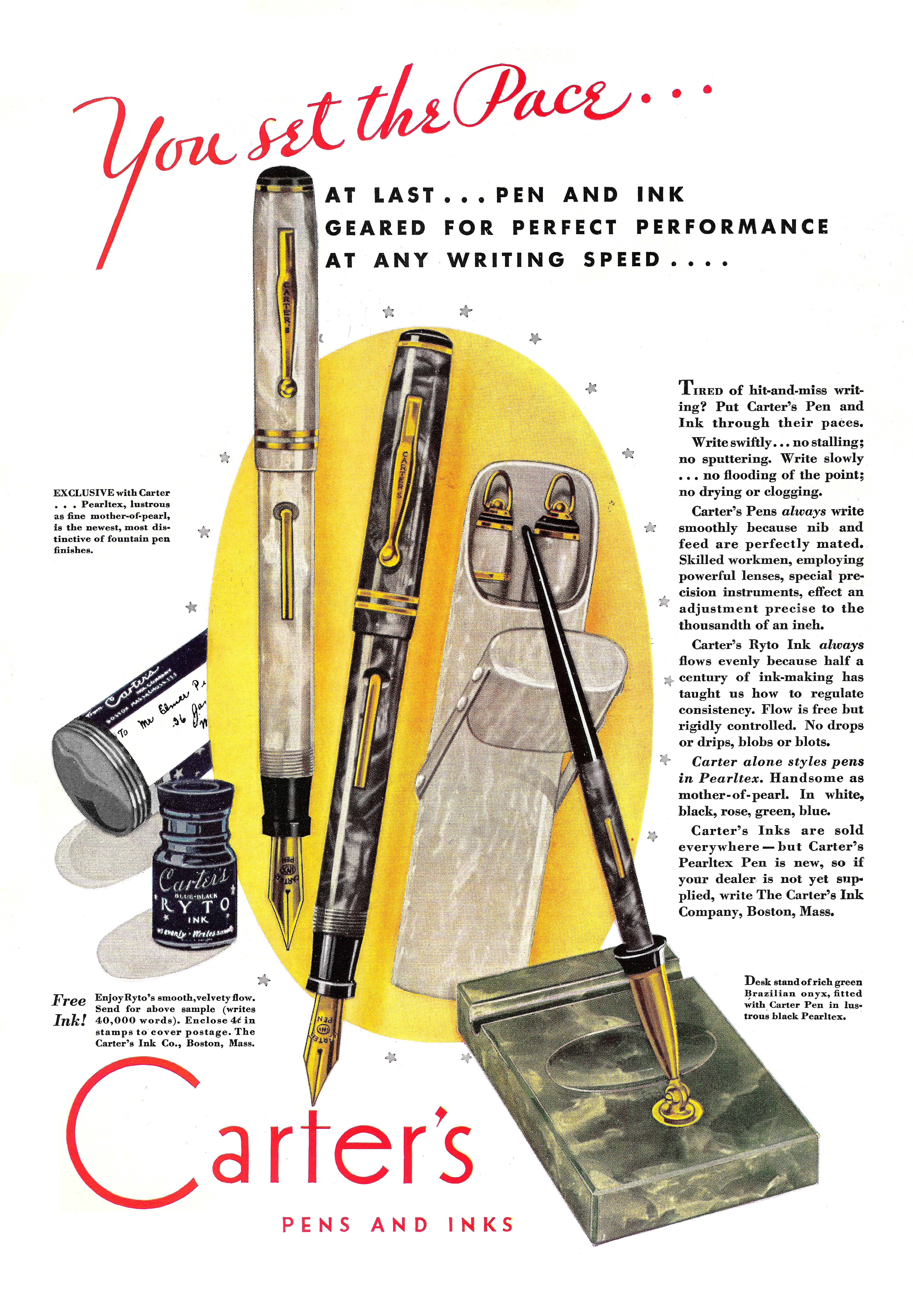Scansione di una pubblicità Carter datata 1930. Pubblicazione su: The Saturday Evening Post. Data visibile direttamente. Data indicativa, dal modello e da ricerche su google books con risultati solo per questo anno. Ritoccata dall'autore per una migliore nitidezza. Pubblicizza le Carter Pearltex Pen, in Pearltex nella nuova versione streamlined.