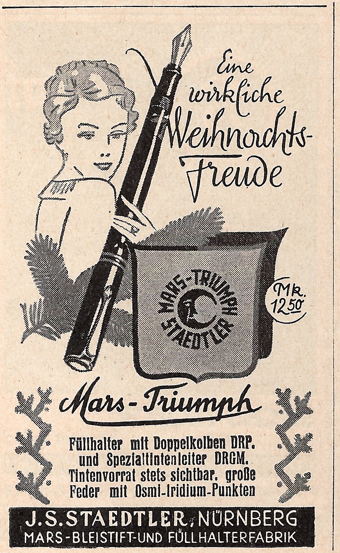Scansione di una pubblicità Staedtler datata 1937-12. Pubblicazione su: Kosmos. Ritoccata dall'autore per una migliore nitidezza. Data indicata dal fornitore. Pubblicizza una stilografica Mars Triumph Staedtler.