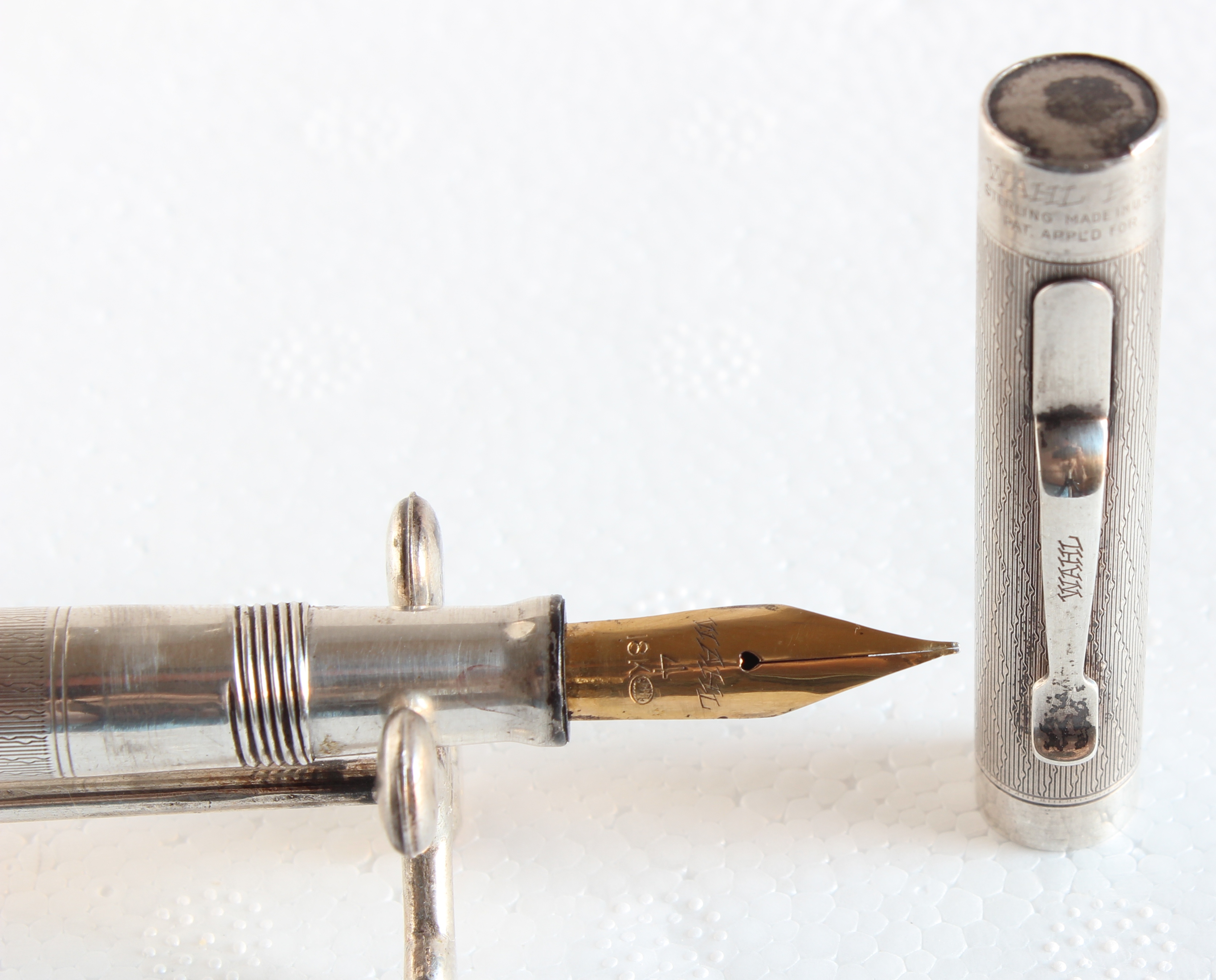 Photo of an Eversharp Wahl Engine Turned model, Sterling Silver version medium/large size, nib n.4, in Ripple Pattern.
