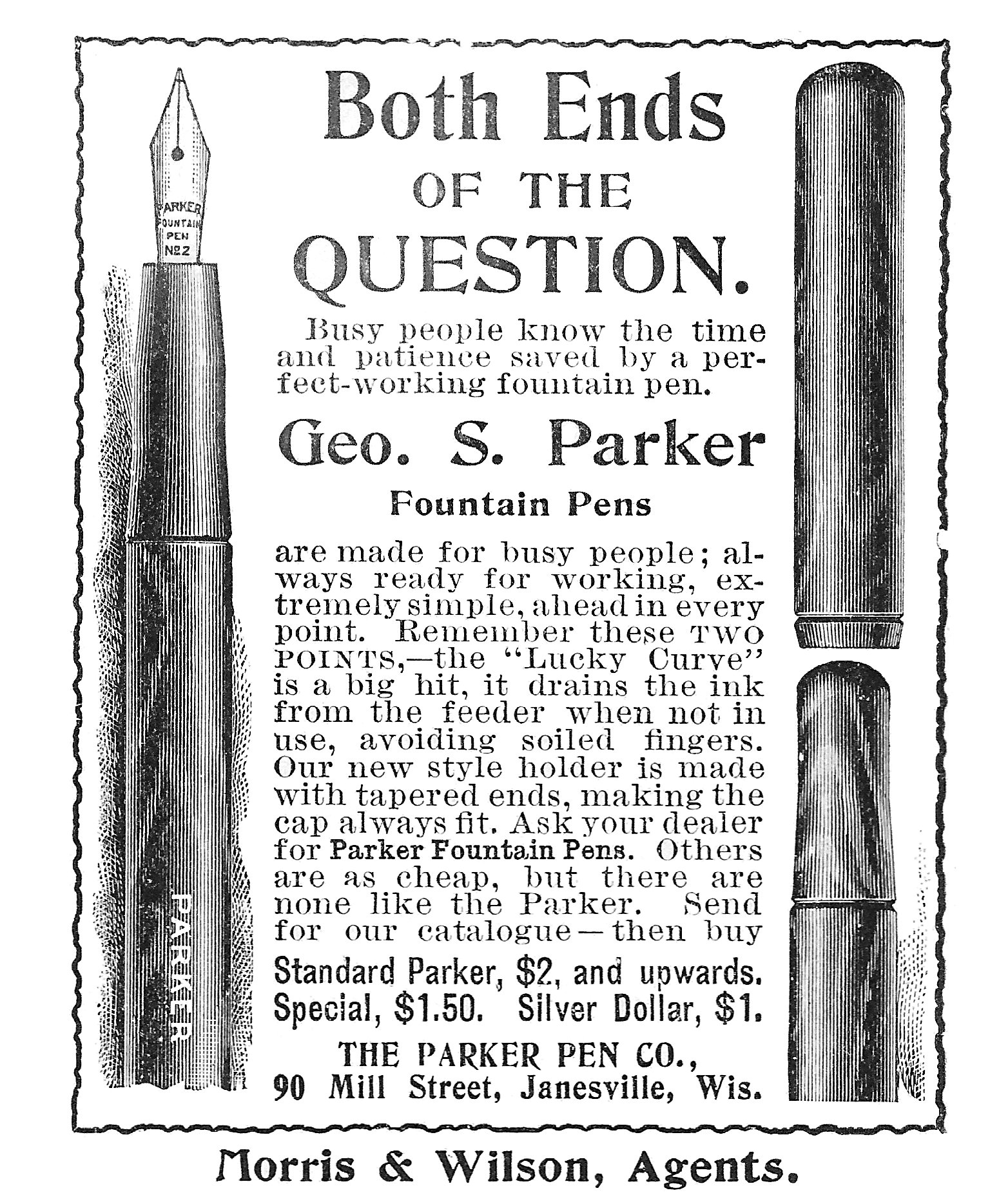 Scansione di una pubblicità Parker datata 1898-09. Ritoccata dall'autore per una migliore nitidezza. Data da un riferimento sulla stessa pagina, relativo all'avvio dei corsi dell'Università del Minnesota per il settembre 1898. Pubblicizza un modello Parker Lucky Curve molto antico in varie versioni ("Standard Parker", "Special" e "Silver Dollar"), menzionando l'alimentatore Lucky Curve.