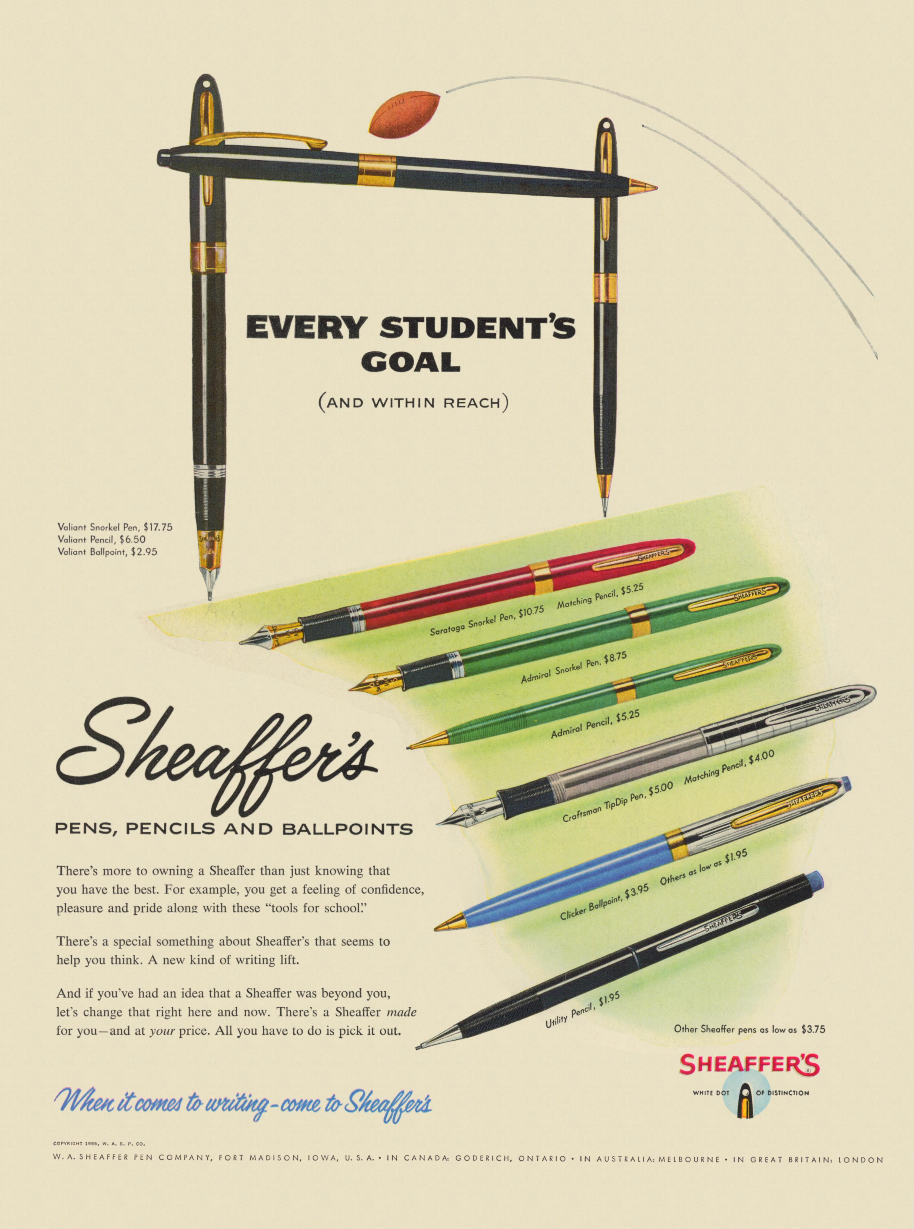 Scansione di una pubblicità Sheaffer datata 1955-08-22. Pubblicazione su: Life. Ritoccata dall'autore per una migliore nitidezza. Data riportata sul retro del foglio. Pubblicizza una serie di Snorkel Pen: versioni Valiant, Saratoga, Admiral e Craftsman.