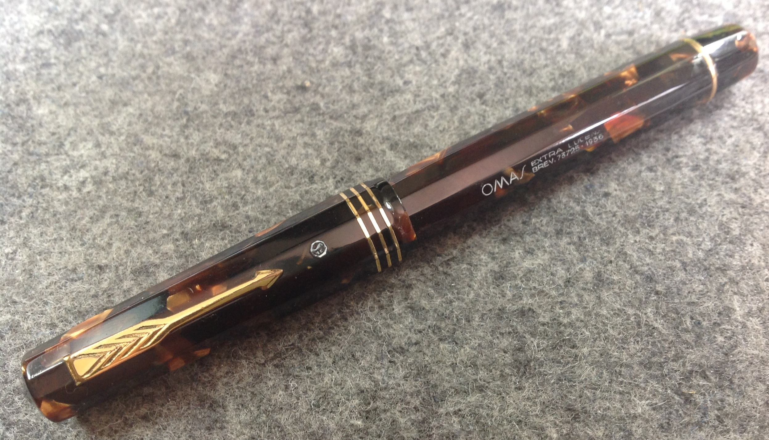 Photo of an Omas Extra Lucens, in marbled brown celluloid. Biggest size.