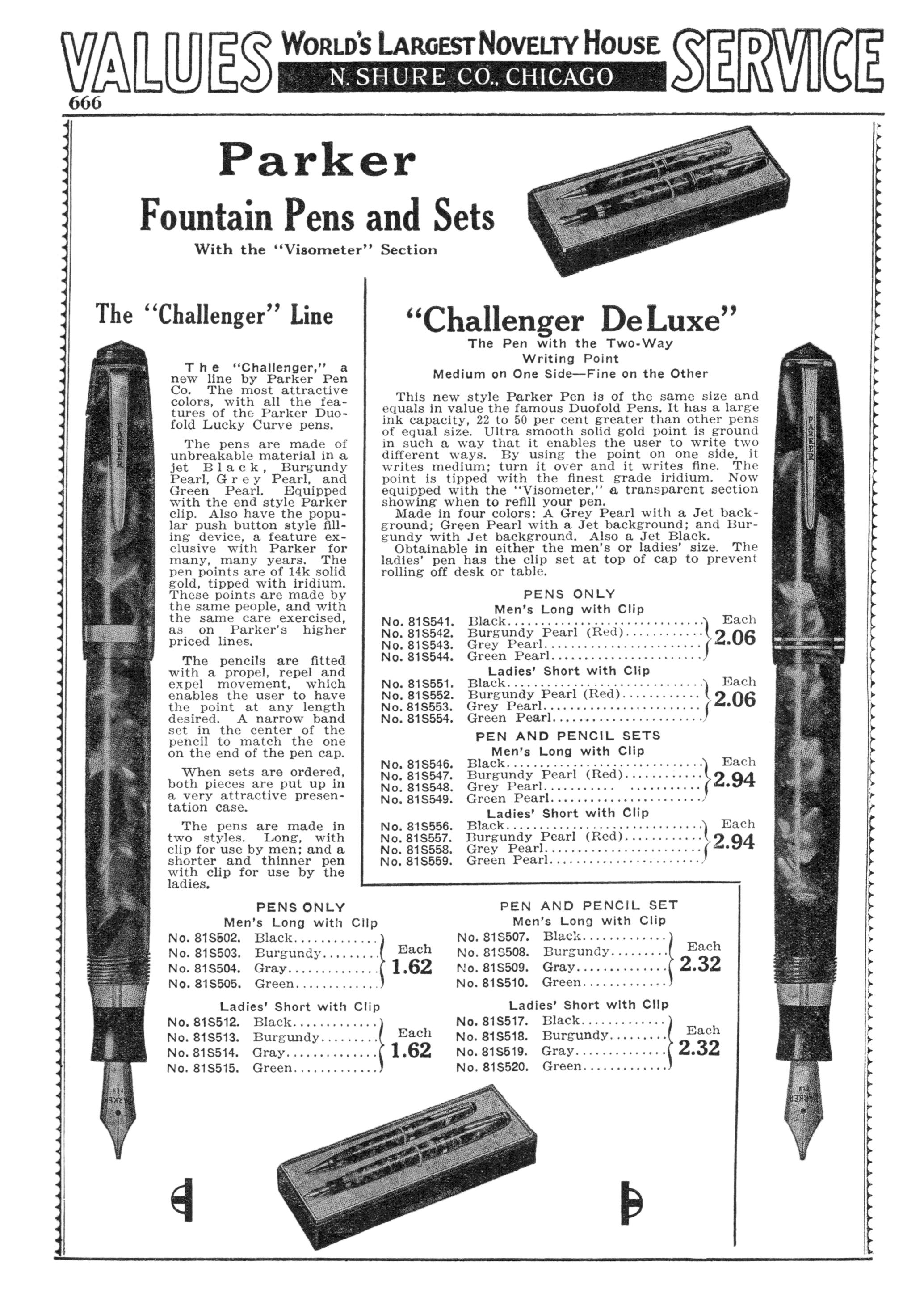 Scanning of a catalog page dated 1938. Published on: N. Shure Catalog. Retouched by the author for a better sharpness. Dating given by the provider. Advertising for the Parker models Challenger (in "Black", "Burgundy", "Gray" and "Green" colors) and Challenger De Luxe (in "Black", "Green Pearl", "Burgundy Pearl" and "Gray Pearl" colors, citing also two different writing sizes using the dry side of the nib). Both models in two sizes: "Men's Long with Clip" and "Ladies' Short with Clip". Mention also the Visometer ink level visualization system. Citing to the Duofold model. On the other side of File:1938-Shure-Parker-Eversharp-p665.jpg.