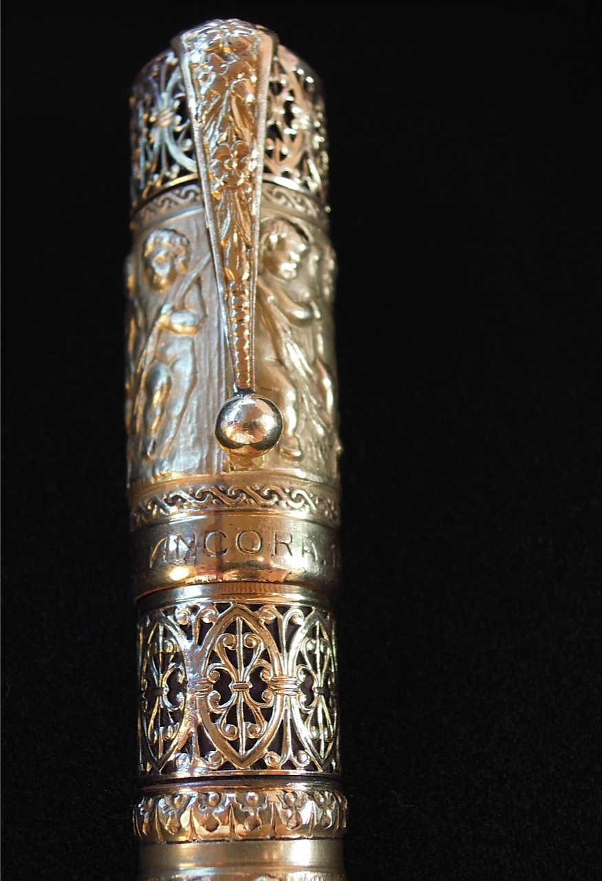 Foto di una Ancora 75 con decorazione laminata con bassorilievi di putti. Contributo di Roberto Vetrugno (utente forum.fountainpen.it roberto v).