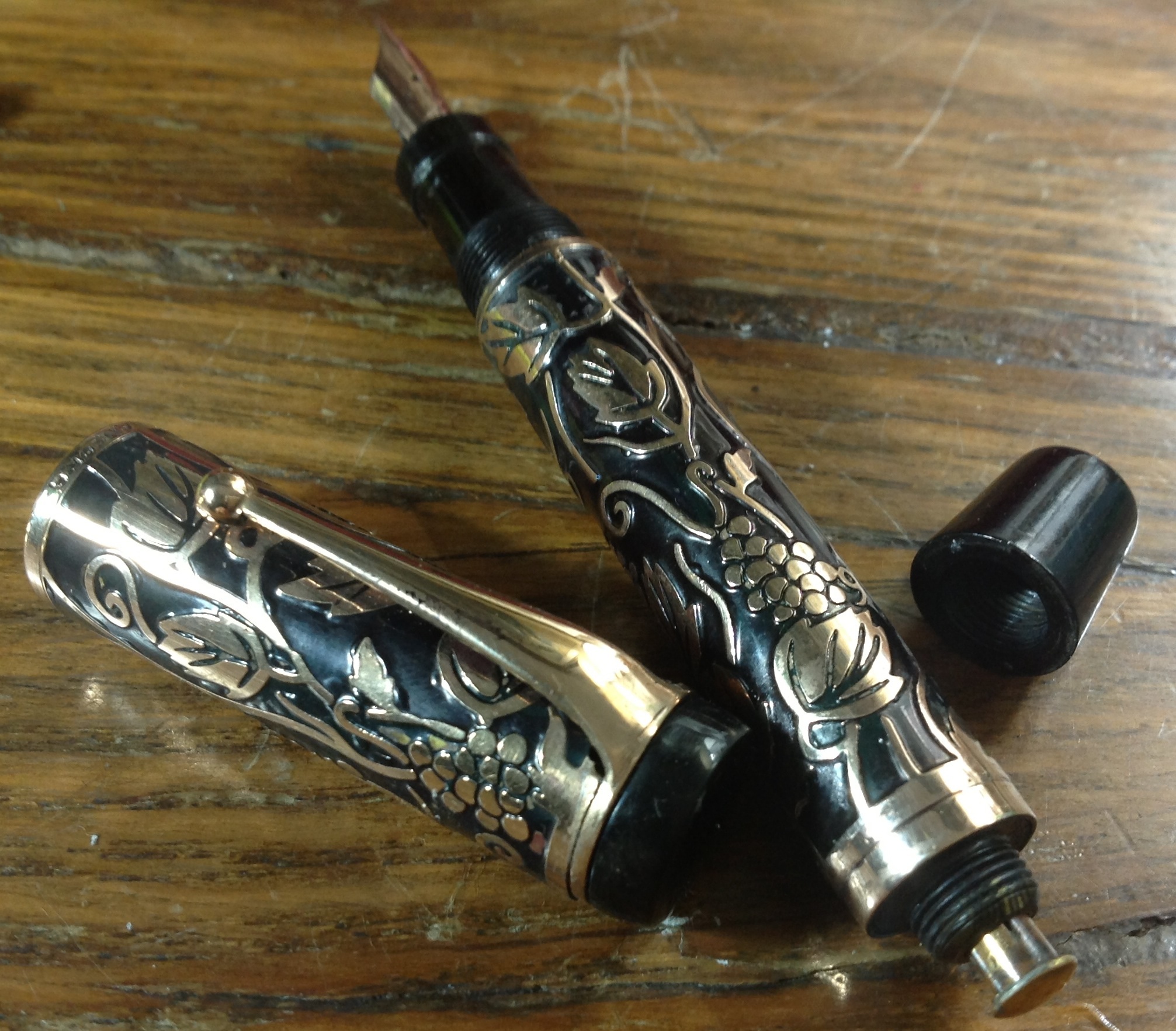 Foto di una penna Ancora. Modello: Ancora Flat-top. Caricamento a pulsante di fondo. Realizzazione con rivestimento laminato laminato oro a motivi di tralci di vite smaltato. Contributo di Massimo, utente forum Maxpen2012.