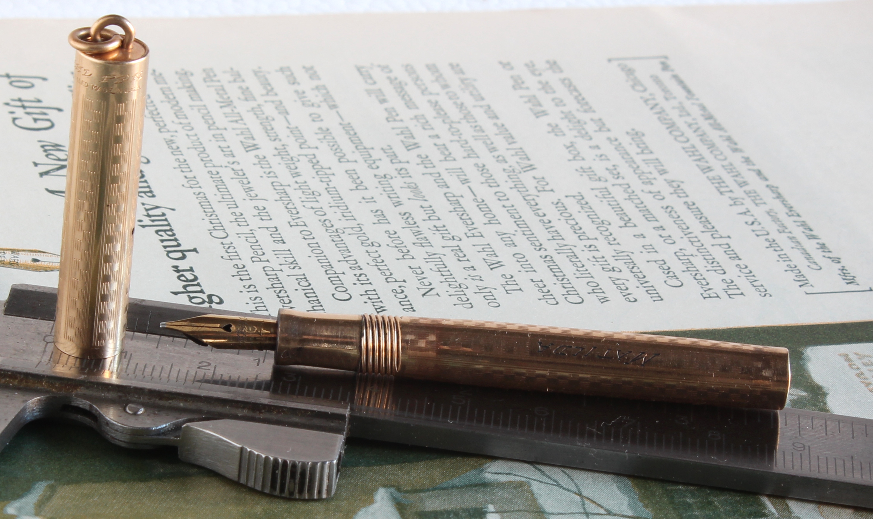 Foto di una Eversharp modello Wahl Engine Turned, versione Gold Filled e dimensione mignon da signora, pennino n. 0, nella lavorazione Checkerboard.