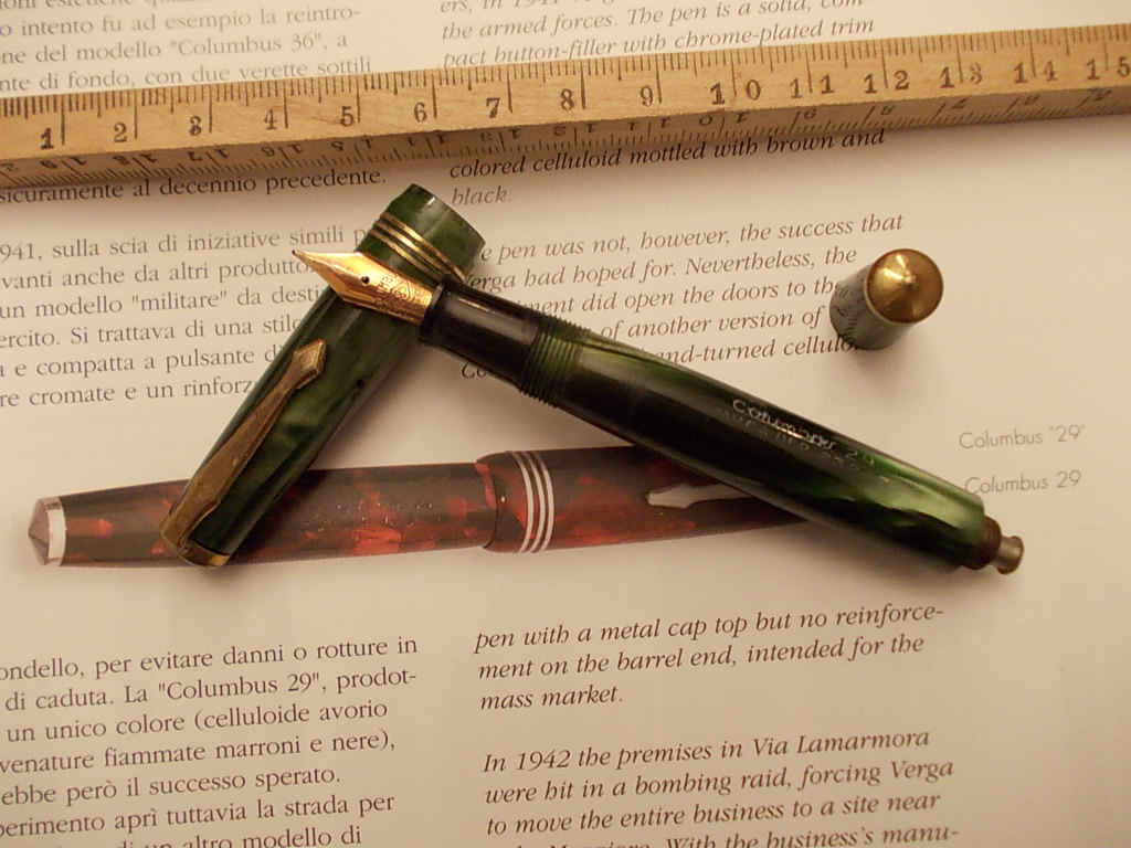 Photo of a pen produced by Columbus. Model: Columbus 29. Filling system: button filler. In marbled green celluloid. Uncommon version with gold plated trims and gold nib.
