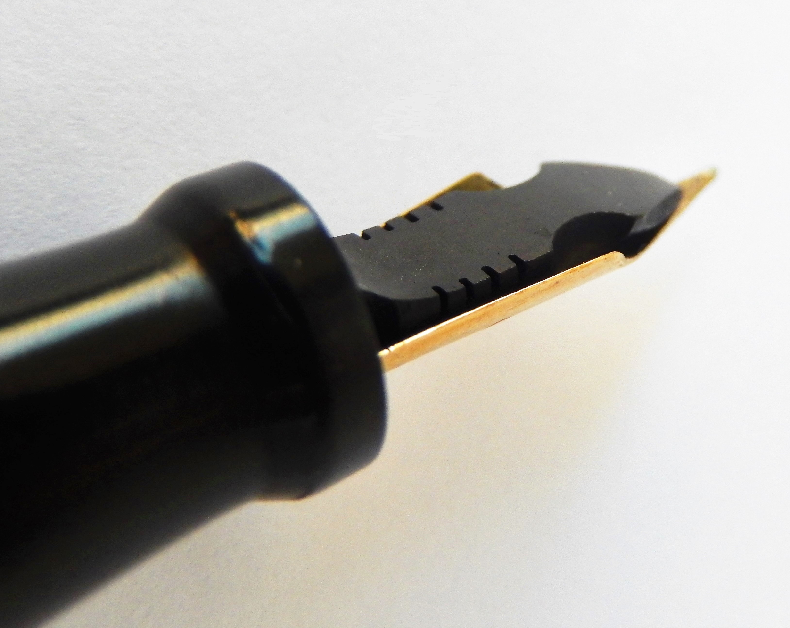 Photo of a pen produced by Conklin. Model: Nozac. Filling system: piston filler. In marbled green celluloid. Detail of feeder. Version with 14 sides, single band, Cushon Point nib, produced in Chicago.