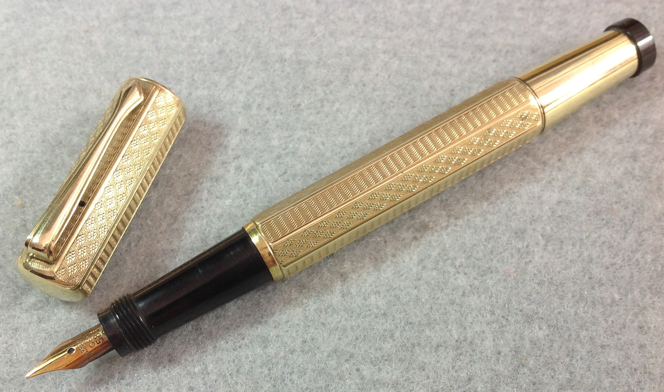 Photo of a pen produced by Europa. Filling system: safety. With geometric patter gold rolled overlay. Model by Fratelli Cavaliere, with a Linda Darnes punch.