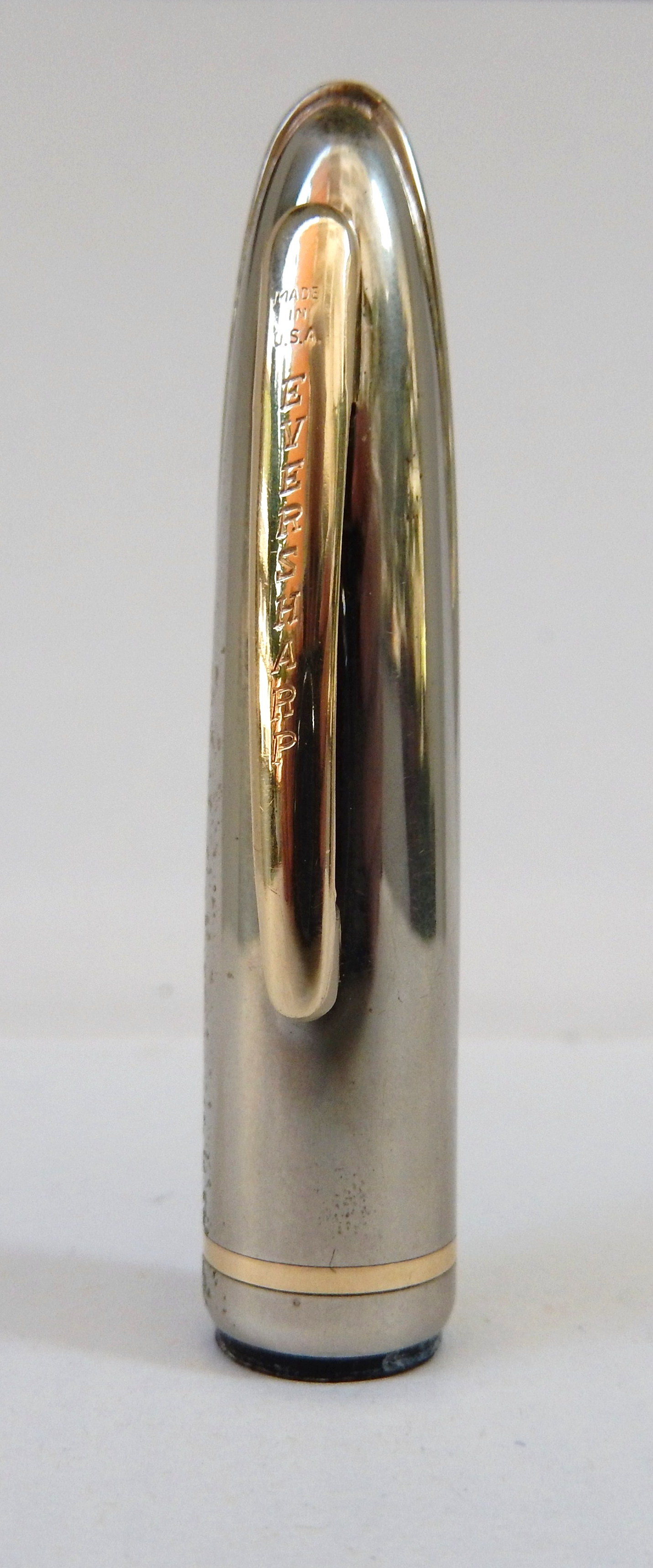 Foto di una penna Eversharp. Modello: Symphony. Caricamento a levetta. Realizzazione in resina plastica verde. Dettaglio del cappuccio. Seconda versione. Contributo di Luigi (utente forum lucre).
