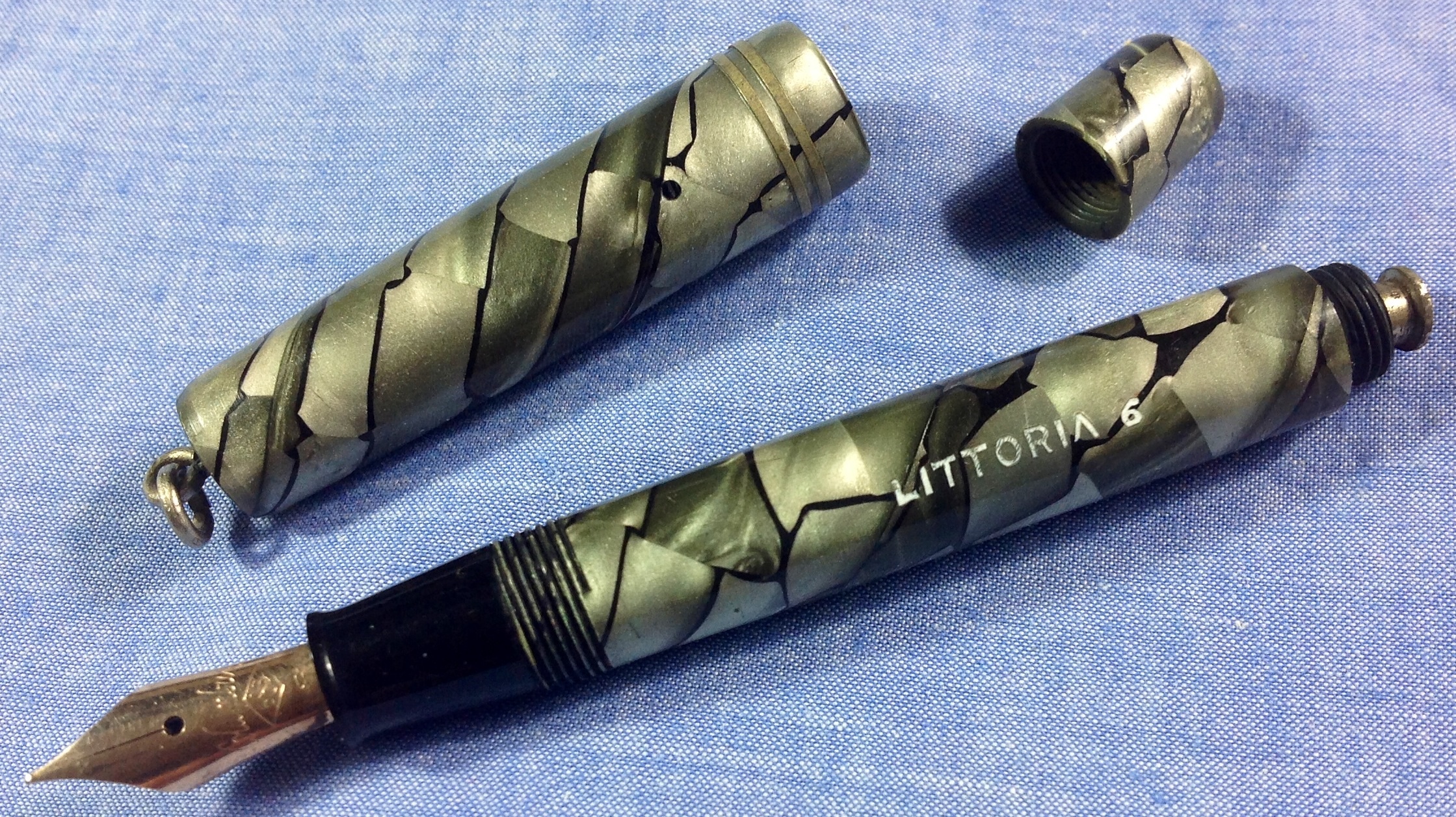 Foto di una penna Littoria. Modello: Littoria 6. Caricamento a pulsante di fondo. Realizzazione in celluloide marmorizzata verde. Versione di signora, realizzata da striscie incollate a spirale. Contributo di Massimo, utente forum Maxpen2012.