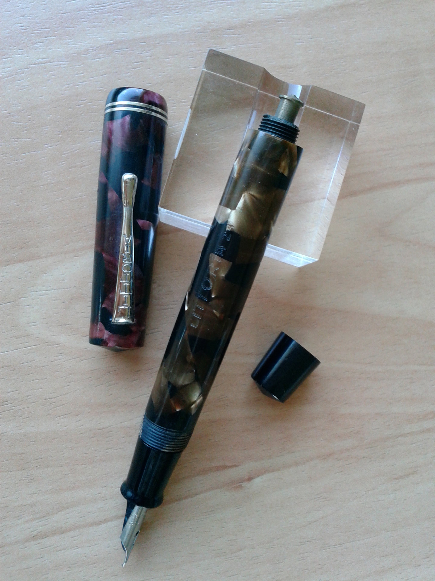 Foto di una penna Littoria. Modello: Littoria 24. Caricamento a pulsante di fondo. Realizzazione in celluloide marmorizzata. Penna probabilmente ricomposta con cappuccio porpora e corpo marrone. Contributo di Giorgio (utente forum Musicus).