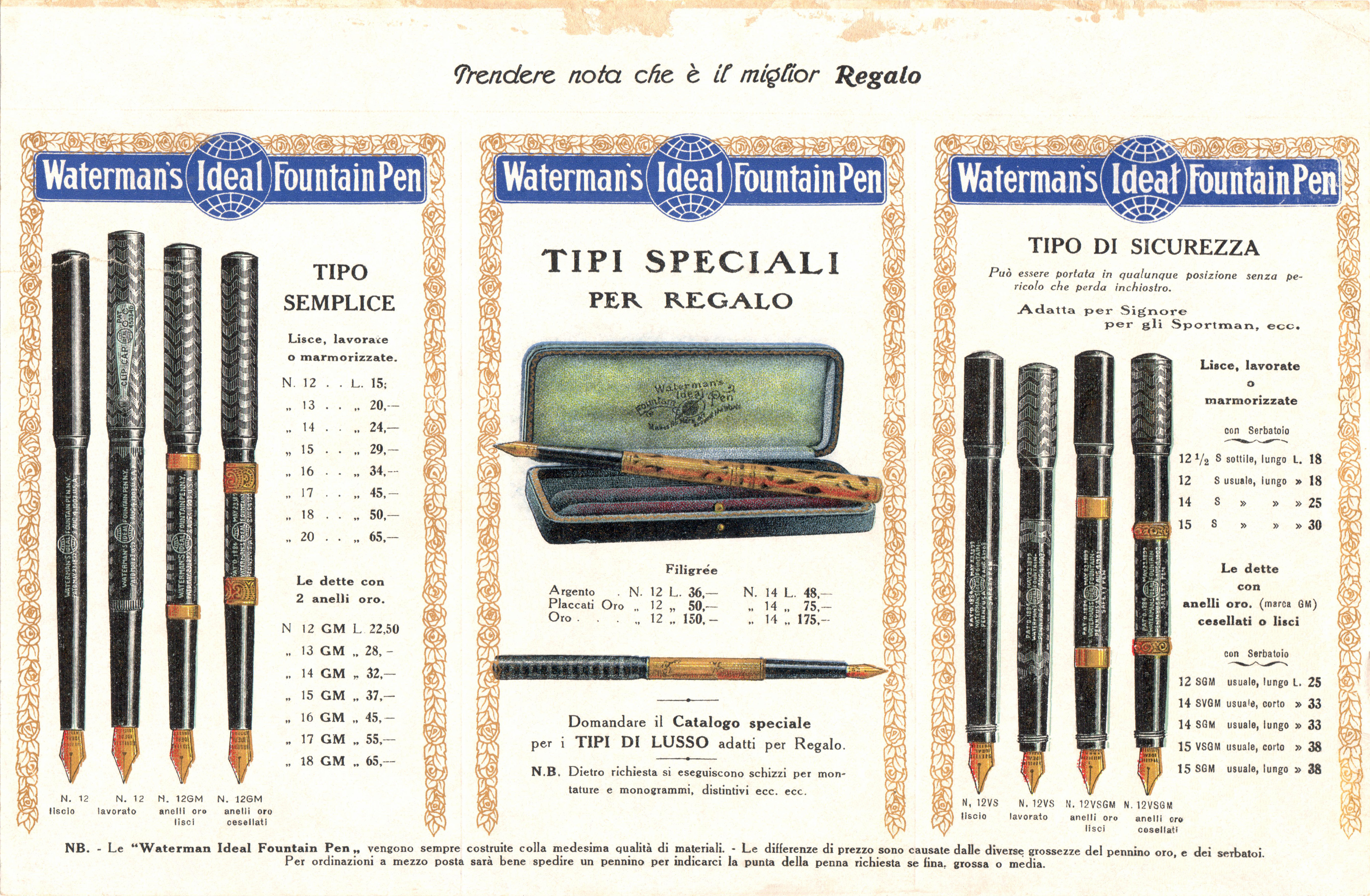 |Note_en=but earlier than 1914, when Cav. Drisaldi became the [[Waterman]] agent in Italy. Internal side. Advertising for model and other products of that time and specifically the [[Waterman 12|12]], the [[Waterman 12S|12S]] and the gold ringed [[Waterman 1x|12GM]]. {{OnBack|File:191x-Waterman-Brochure-Blue-p01.jpg}} | |Note_en=but earlier than 1914, when Cav. Drisaldi became the [[Waterman]] agent in Italy. Internal side. Advertising for model and other products of that time and specifically the [[Waterman 12|12]], the [[Waterman 12S|12S]] and the gold ringed [[Waterman 1x|12GM]]. {{OnBack|File:191x-Waterman-Brochure-Blue-p01.jpg}} | ||
