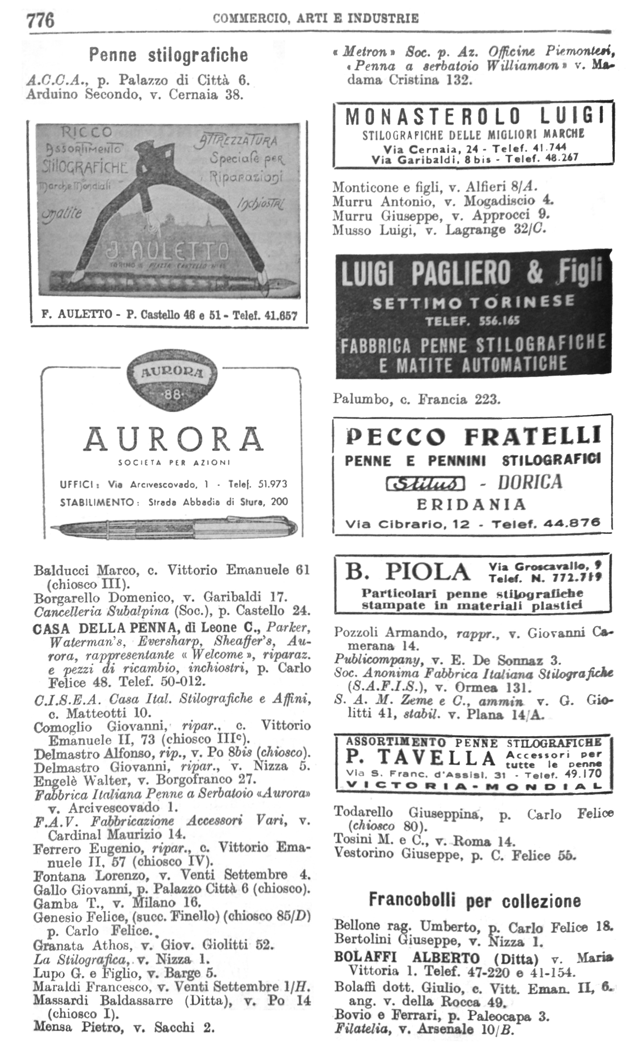 - "Pecco Fratelli", via Cibrario 12, stabilimento in Caluso (Aré), per "stilografiche e pennini autarchici", cita "Stilus - Dorica - Eridania";