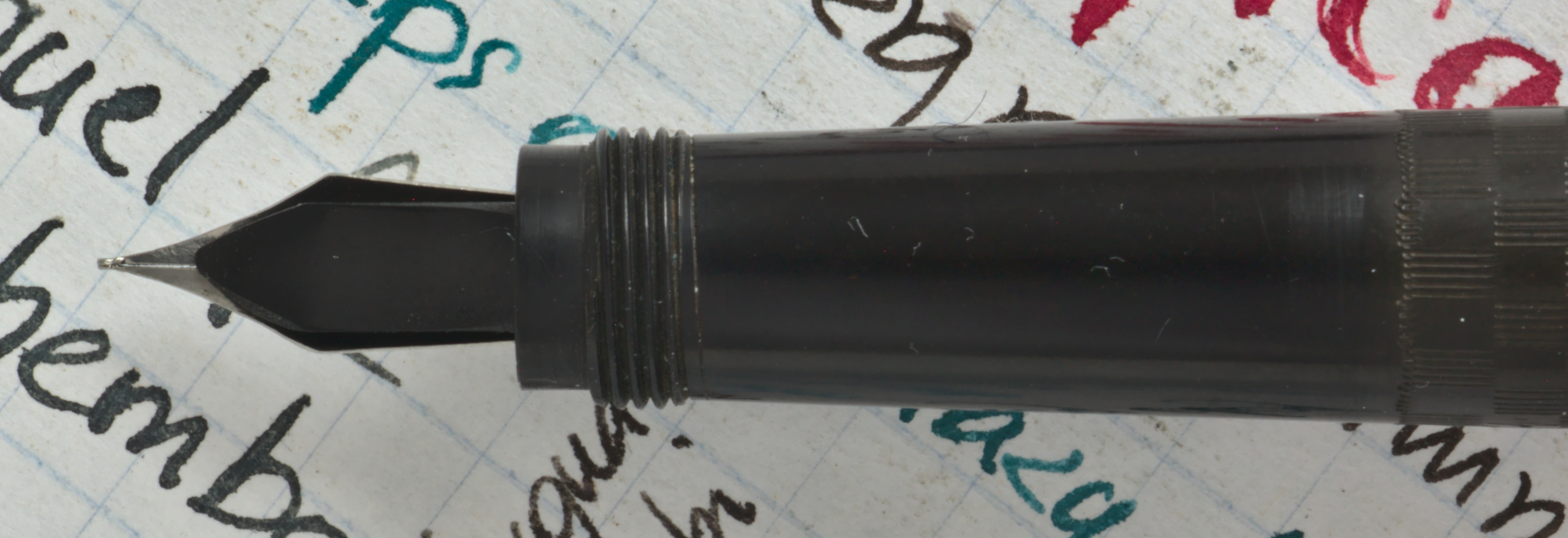 Photo of a pen produced by Olivieri. In checkerboard pattern black chased hard rubber. Detail of feeder. With accommodation clip.