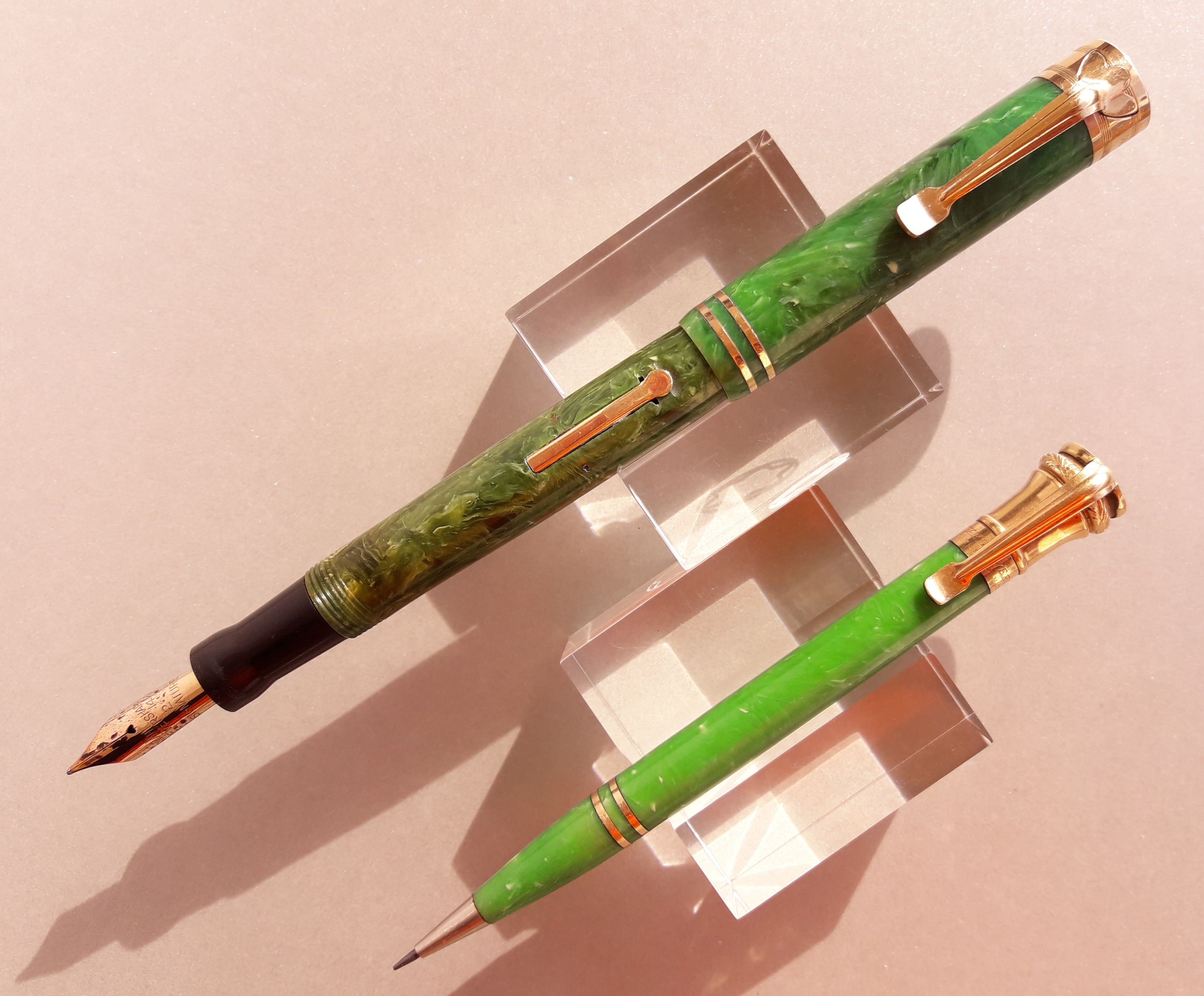 Photo of a pen/pencil set produced by Eversharp. Model: Tulip Clip. Filling system: lever filler. In jade green celluloid. Small size, nib n. 2.