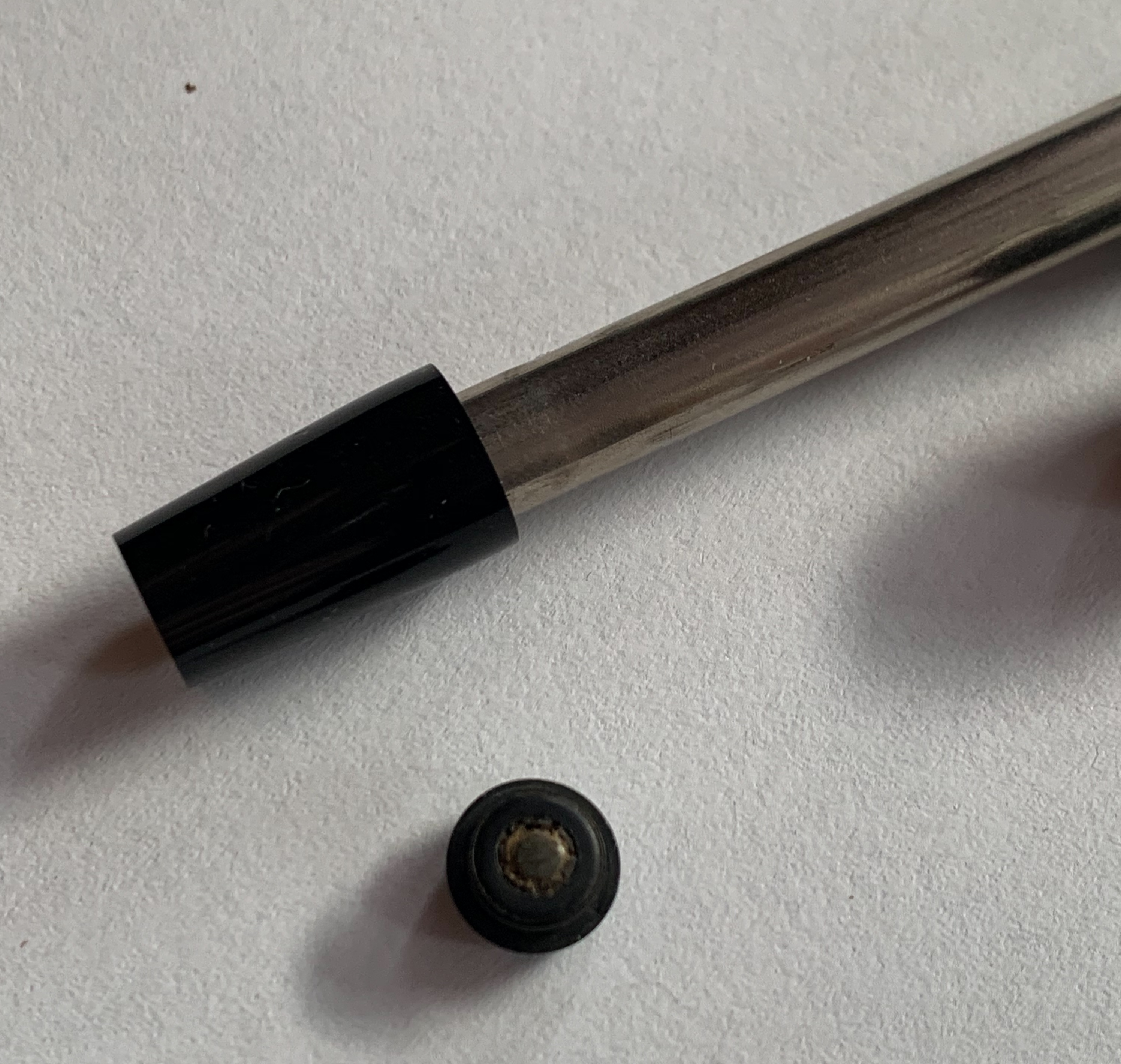 Foto di una penna Montblanc. Modello: Montblanc No. 2. Caricamento pneumatico. Realizzazione in ebanite nera. Dettaglio del caricamento. Dettaglio del fondello. Versione con caricamento Compressor. Riporta stampigliato il numero del brevetto (nº DE-400356). Contributo di Amedeo (utente forum solido).