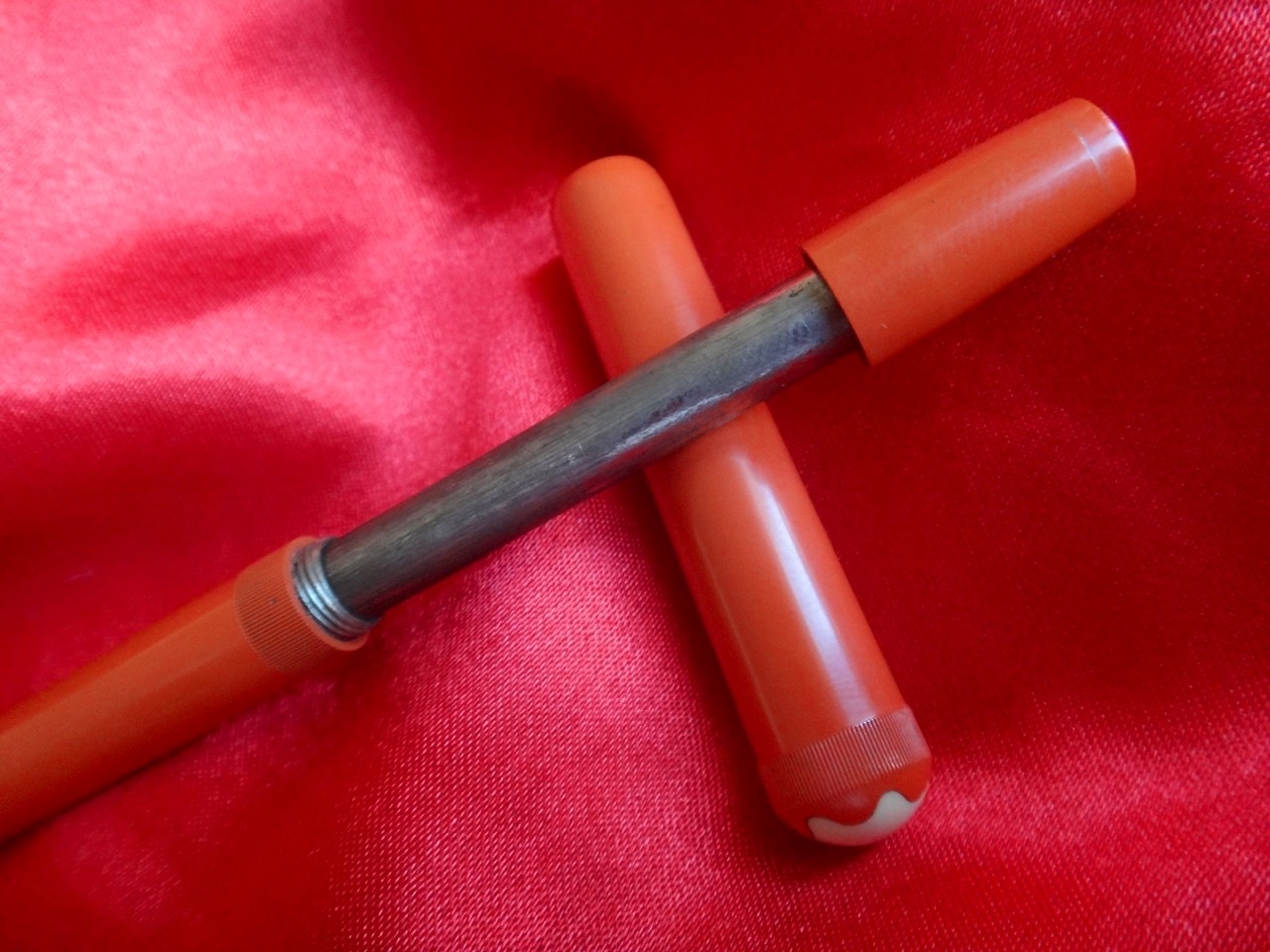 Foto di una penna Montblanc. Modello: Montblanc No. 1. Caricamento pneumatico. Realizzazione in ebanite rossa. Dettaglio del caricamento. Versione con caricamento Compressor, unico esemplare noto in ebanite rossa. Riporta stampigliato il numero del brevetto (nº DE-400356). Contributo di Massimo, utente forum Maxpen2012.