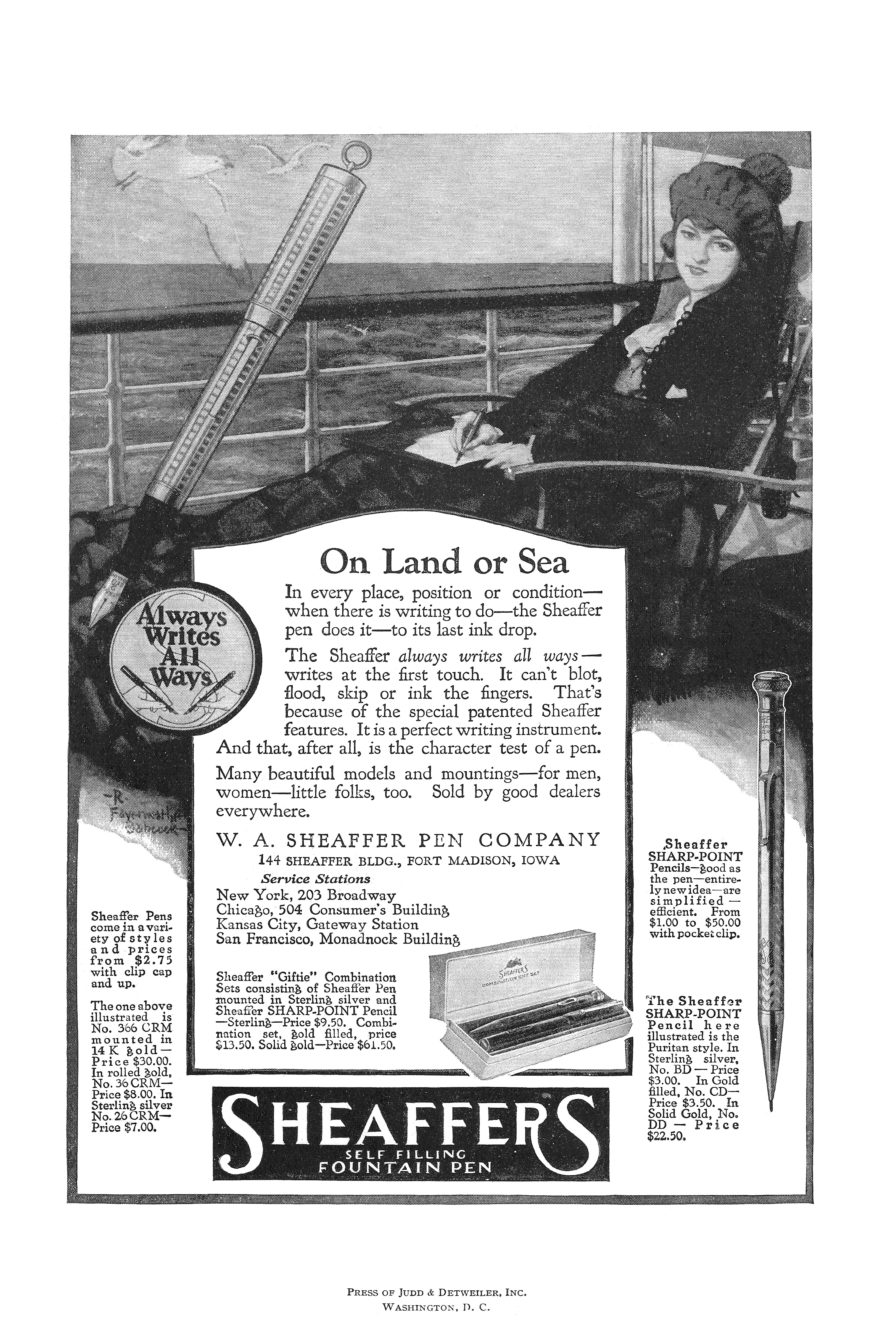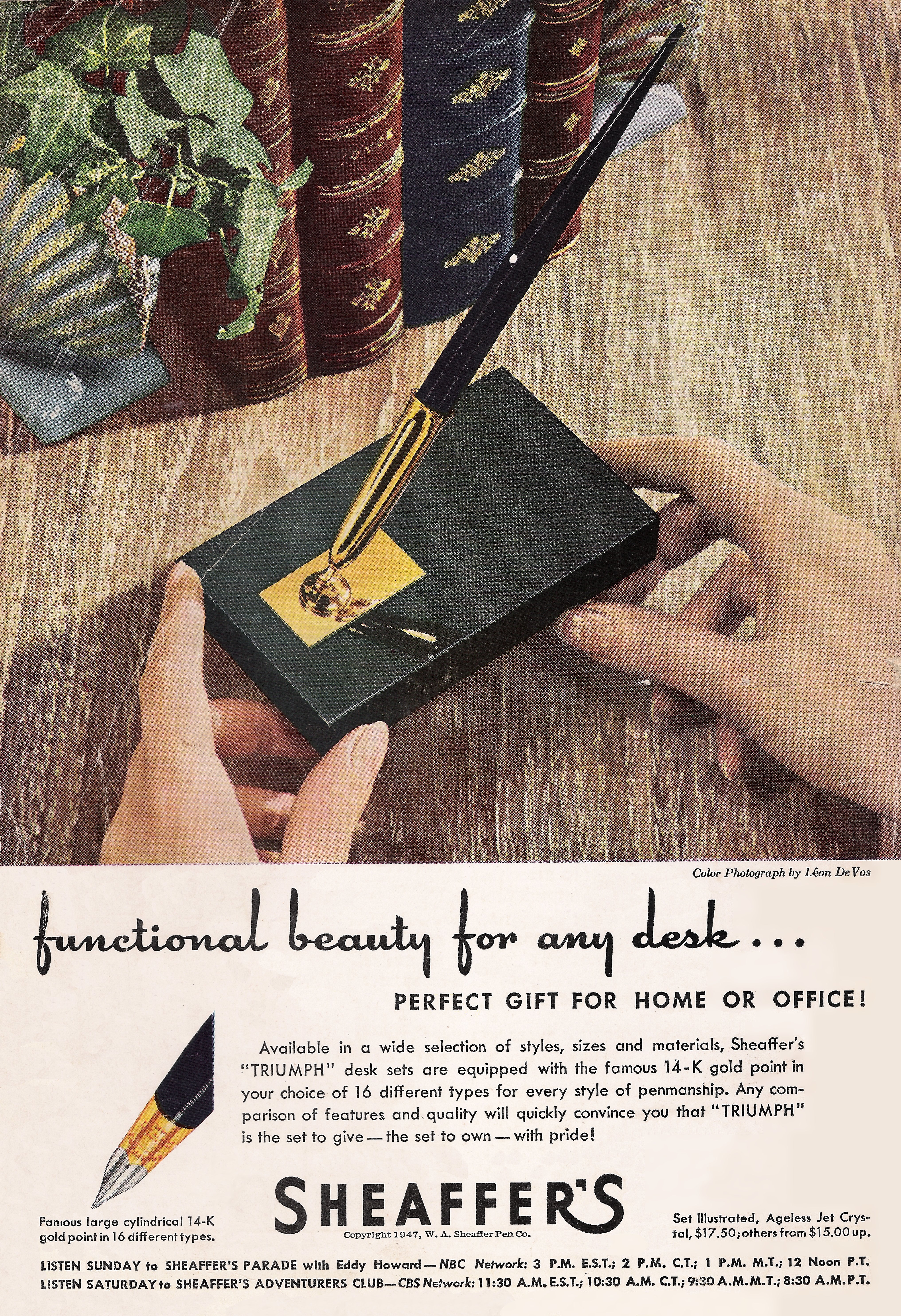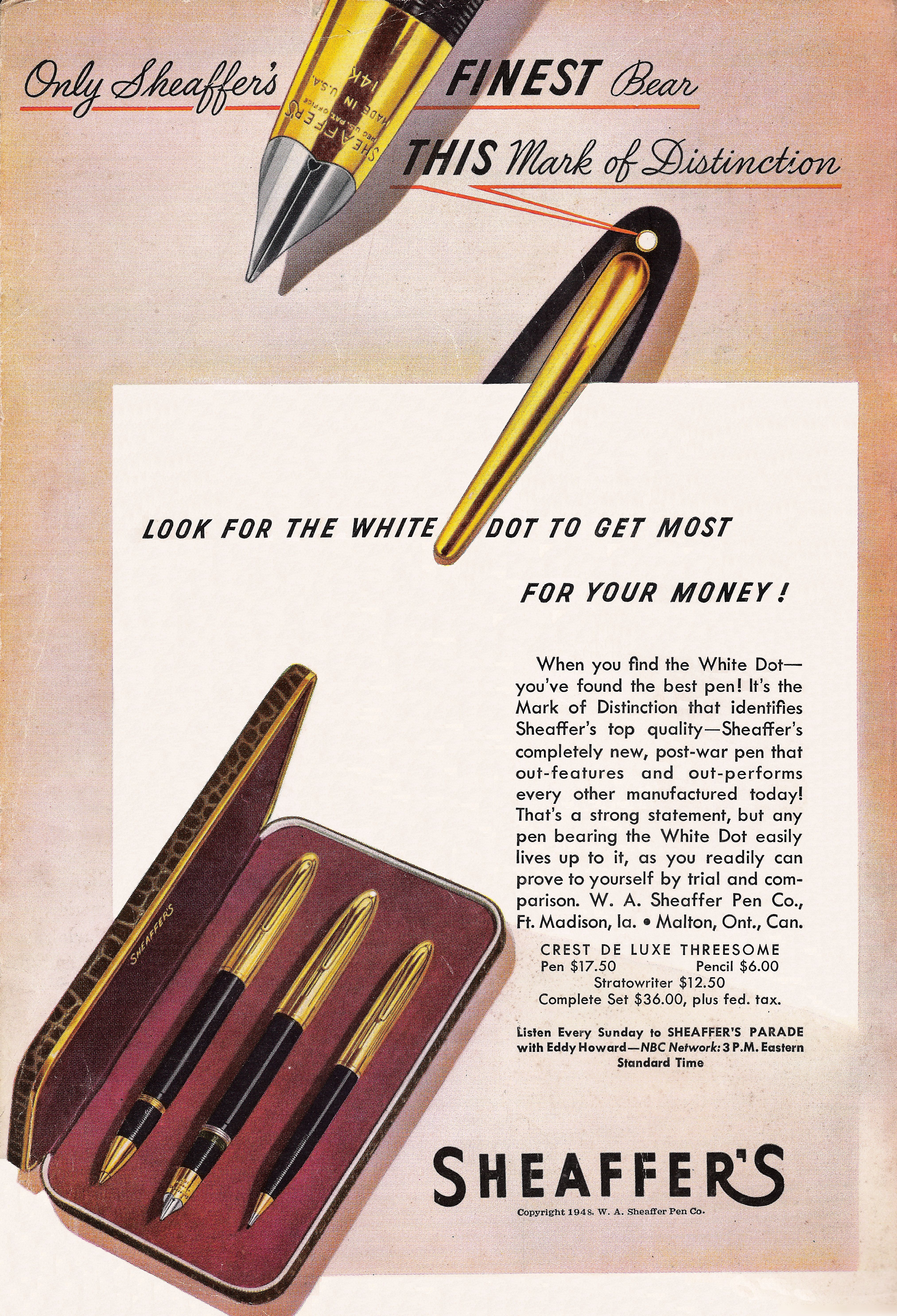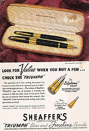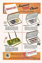 | 13:28, 21 nov 2008 | 1949-Sheaffer-Crest-Tuckaway-Vacfill-Sets.jpg (file) | 7,08 MB | Piccardi | {{Information |Description=Pubblicità si una serie di combinaizioni penna/matita Sheaffer |Source=Da una pubblicità del 1949. |Date=21 Novembre 2008 |Author=[http://www.fountainpen.it/Utente:Piccardi Simone Piccardi] |Permission=GFDL }} ==Informaz | 1 | |