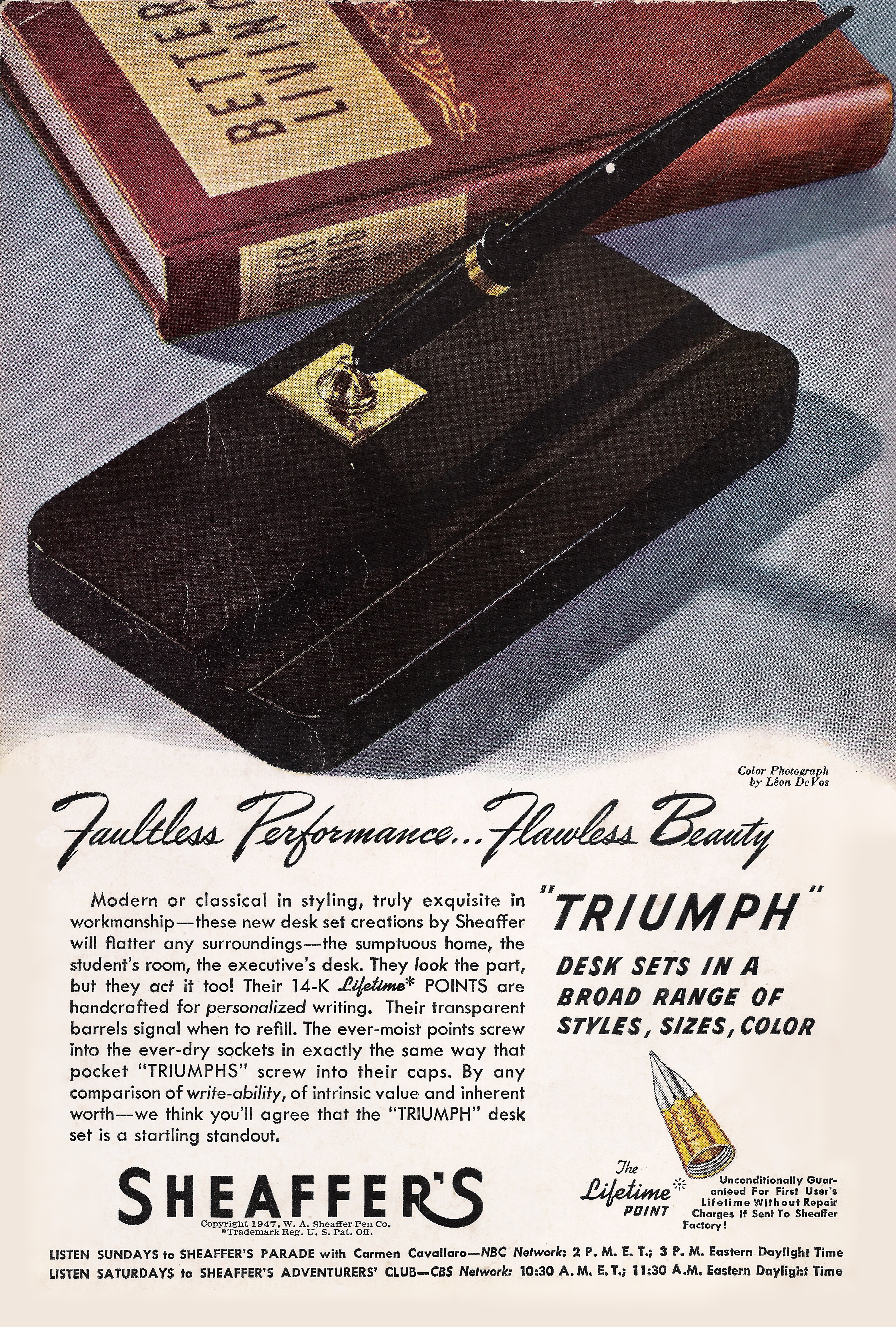 | 22:26, 1 nov 2008 | 1947-Sheaffer-Triumph-Desk-2.jpg (file) | 8,37 MB | Piccardi | {{Information |Description=Pubblicità di una Triumph |Source=Una pubblicità del 1947 |Date=1 Novembre 2008 |Author=[http://www.fountainpen.it/Utente:Piccardi Simone Piccardi] |Permission=GFDL }} ==Informazioni== Scansione di una pubblicità del 19 | 1 | |