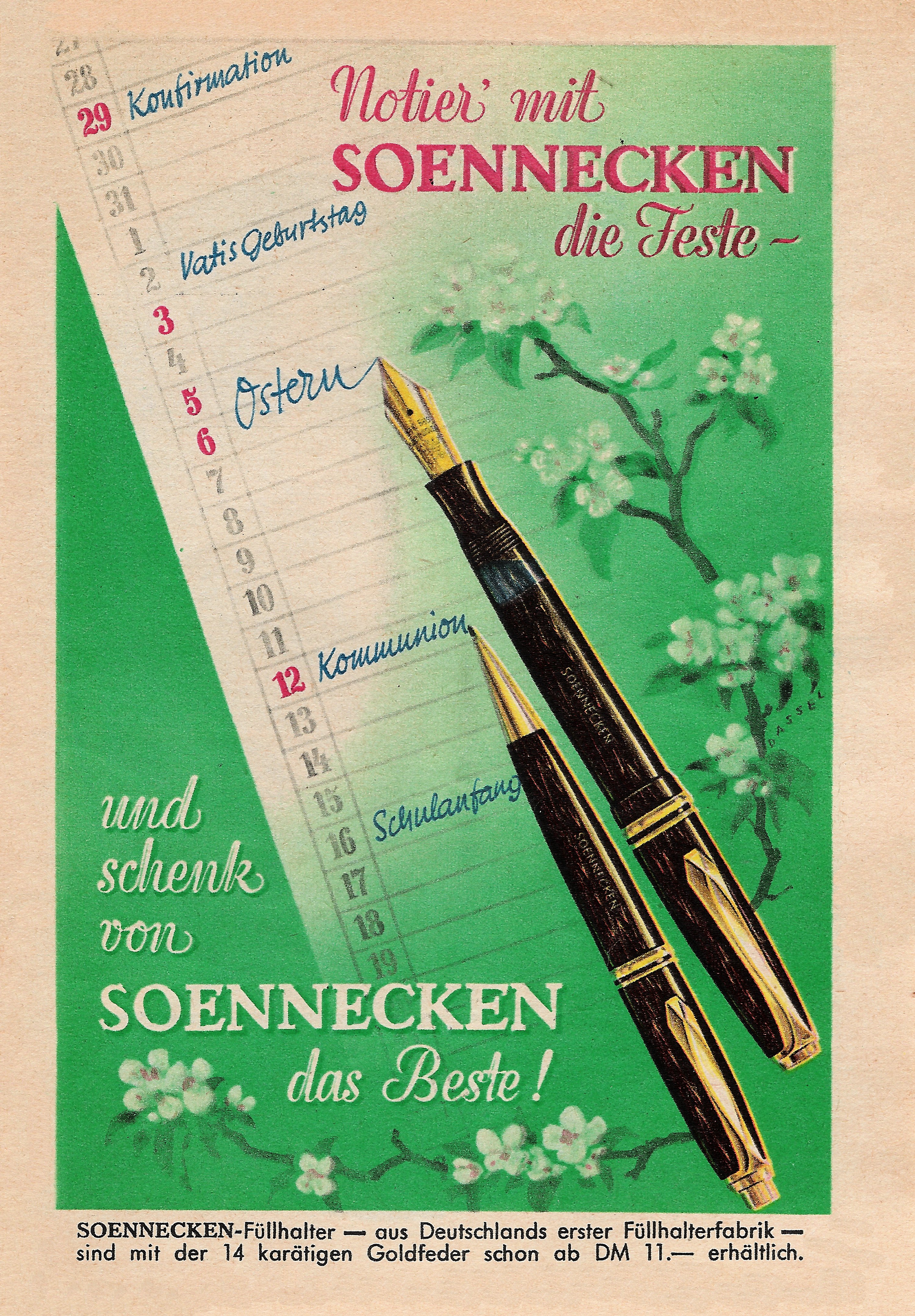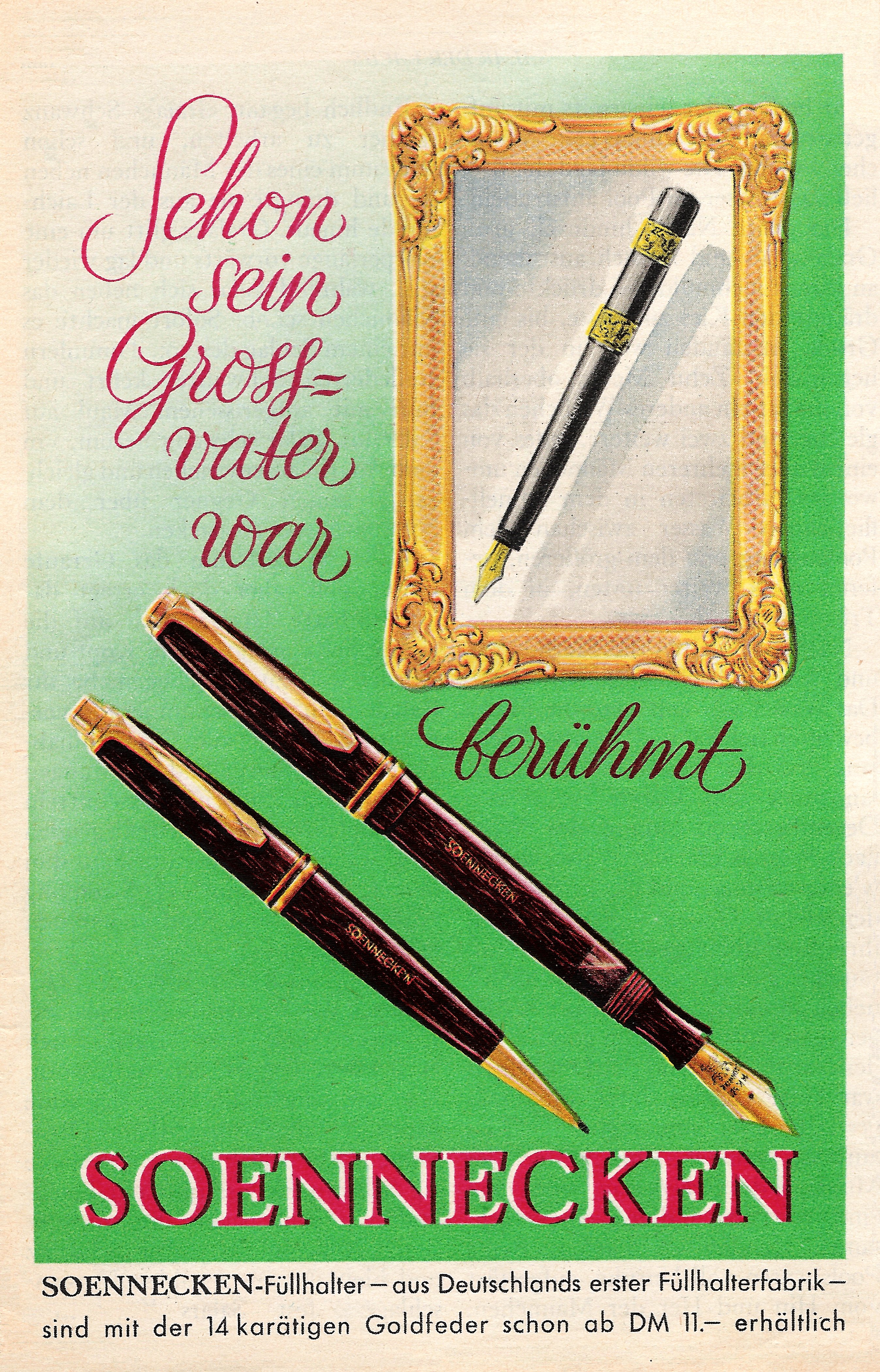 | 01:05, 9 dic 2008 | 1953-Soennecken-111-Set-Elegant.jpg (file) | 2,36 MB | Piccardi | {{Information |Description=Pubblicità della Soennecken |Source=Da una pubblicità degli anni '50 |Date=9 Dicembre 2008 |Author=[http://www.fountainpen.it/Utente:Piccardi Simone Piccardi] |Permission=GFDL }} ==Informazioni== Scansione di una pubblic | 1 | |