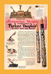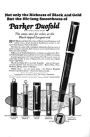 | 23:49, 26 giu 2008 | 1927-Parker-Duofold-Pressureless-Colors.jpg (file) | 5,72 MB | Piccardi | {{Information |Description=Pubblicità della Duofold |Source=una pubblicità del 1927 |Date=27 Giugno 2008 |Author=[http://www.fountainpen.it/Utente:Piccardi Simone Piccardi] |Permission=GFDL }} ==Informazioni== Scansione di una pubblicità della [[ | 1 | |