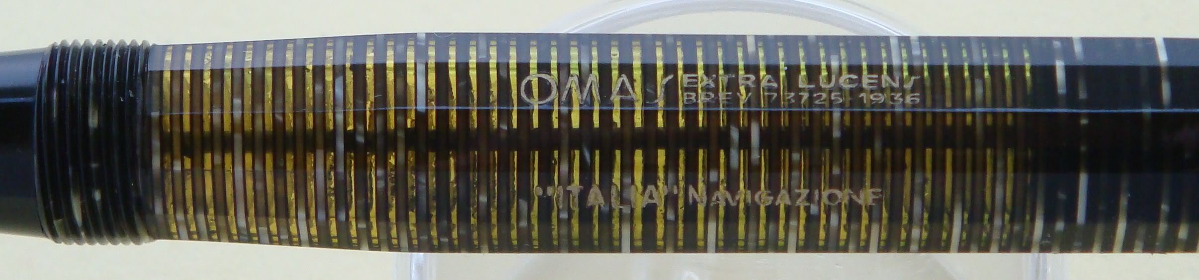 Foto di una penna Omas marcata "Italia Navigazione". Modello: Extra Lucens. Caricamento a stantuffo tuffante. Realizzazione in celluloide anellata grigia. Dettaglio della stampigliatura. Misura media. Versione con tre anellini, finiture dorate. Riporta stampigliato il brevetto nº IT-73725-1936. Contributo di Roberto Vetrugno (utente forum.fountainpen.it roberto v).