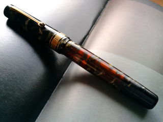 Foto di una penna Omas. Modello: Lucens. Caricamento a stantuffo tuffante. Realizzazione in celluloide. Misura media, prima variante con vera grecata ed anellini di contorno. Riporta stampigliato il brevetto nº IT-73725-1936. Contributo di Giorgio (utente forum Musicus).