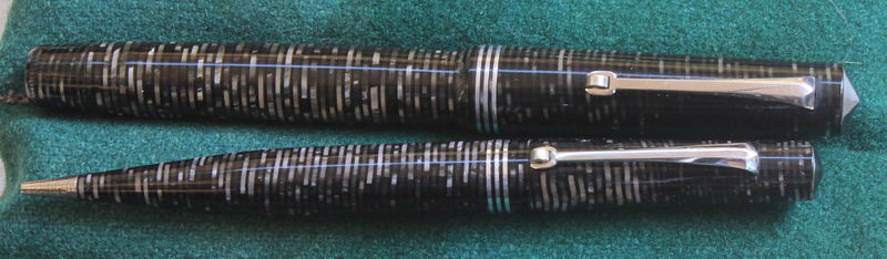 Photo of a pen/pencil set produced by Omas. Model: Lucens. Filling system: "stantuffo tuffante". In ringed grey celluloid. Medium size. Three rings version, with white finish. Courtesy of Luigi Maccagli. Photographed at 2016 Rome Pen Show.