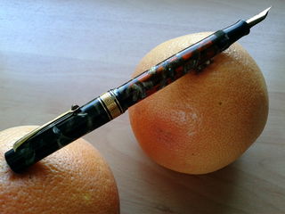 Foto di una penna Omas. Modello: Lucens. Caricamento a stantuffo tuffante. Realizzazione in celluloide verde marmorizzato. Misura media, prima variante con vera grecata ed anellini di contorno. Riporta stampigliato il brevetto nº IT-73725-1936. Contributo di Giorgio (utente forum Musicus).