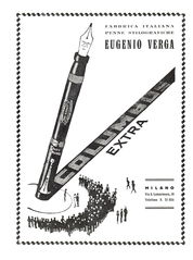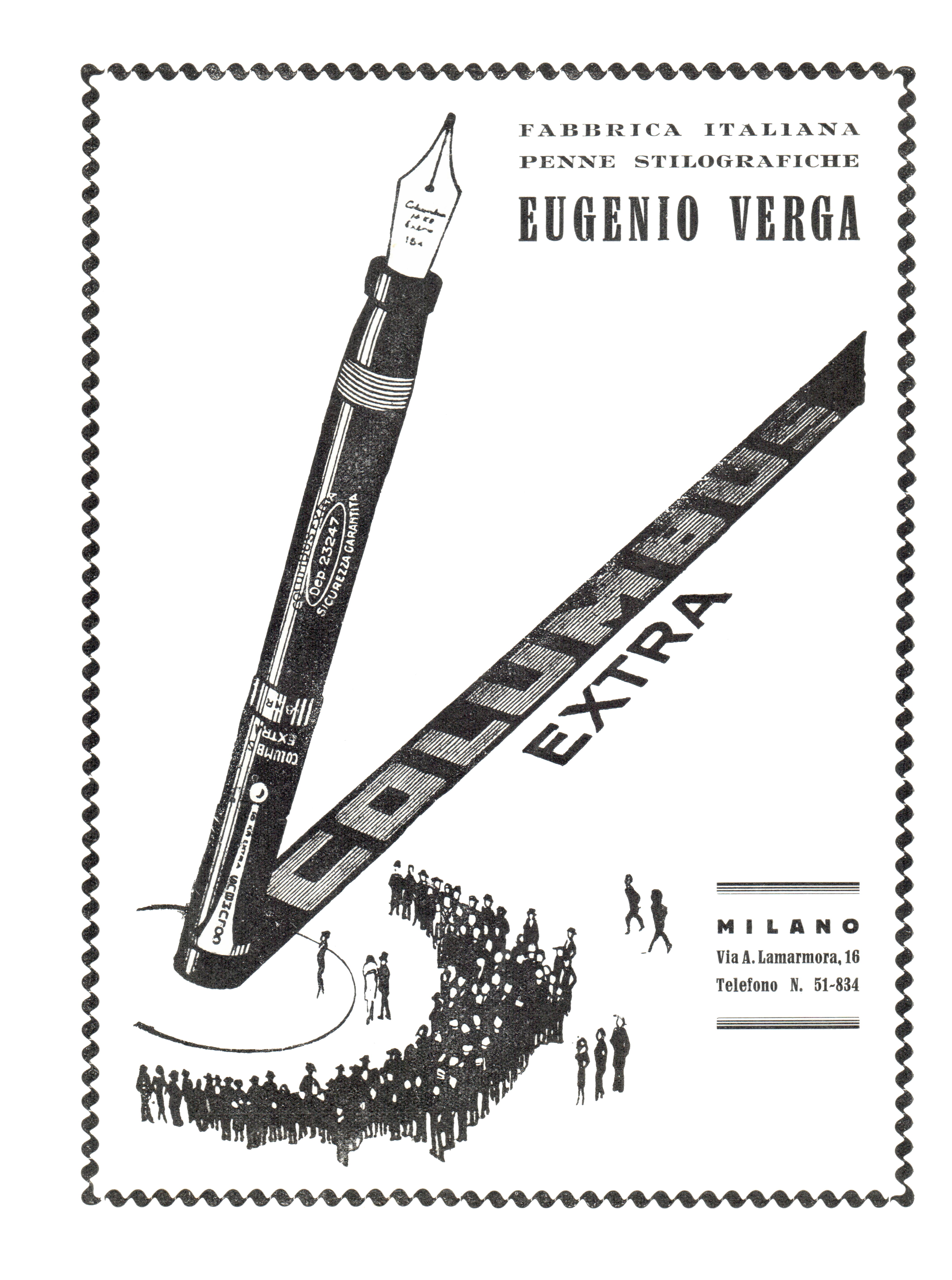 Scanning of advertising from Columbus dated 1935. Published on: Teatro per tutti. Dating given by provider, reliable. Advertising for a Duofold like flat top version of the Columbus Extra model.
