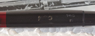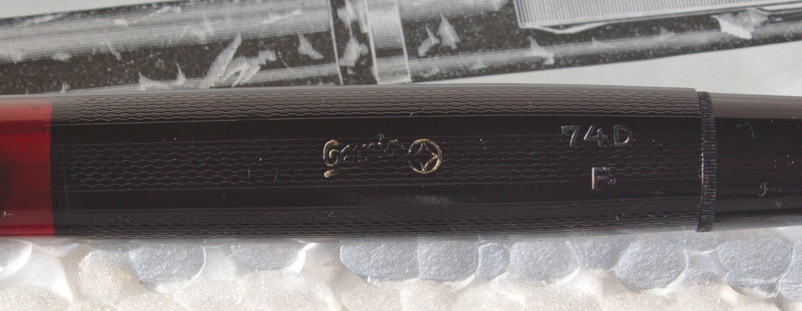 Photo of a pen produced by Osmia. Model: Osmia 74D. Filling system: piston filler. In black chased calluloide. Pen with "Palliag" rigid accountant nib.