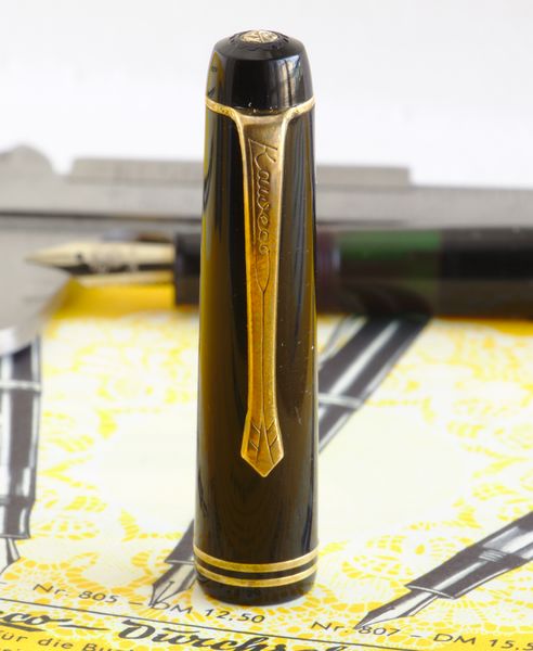 Foto di una penna Kaweco. Modello: Dia 805G. Caricamento a stantuffo. Realizzazione in resina plastica nera. Dettaglio del cappuccio. Marcata per pennino "OB".