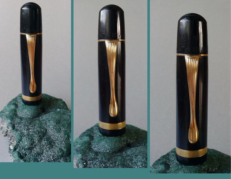 Foto di una penna Pelikan. Modello: Pelikan 100N. Caricamento a stantuffo. Realizzazione in celluloide. Dettaglio del cappuccio. Versione con veretta singola e fermaglio a righe, detta fluted trims, con "binde" verde marmorizzato. Contributo di Giorgio (utente forum Musicus).