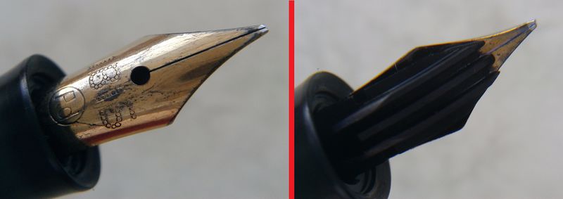 Photo of a Pelikan black Ibis model with hard rubber cap, milled knob and palladium nib. Detail of nib.