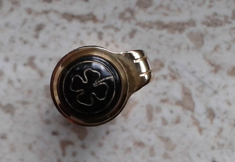 Foto di una penna Radius (sottomarca Società Anonima Fabbrica Italiana Stilografiche). Modello: Fortune 38. Caricamento a stantuffo. Realizzazione in resina plastica nera. Dettaglio della testa del cappuccio. Versione del dopoguerra, somigliante alla Pelikan 400. Contributo di Antonio (utente forum fockerwulf).