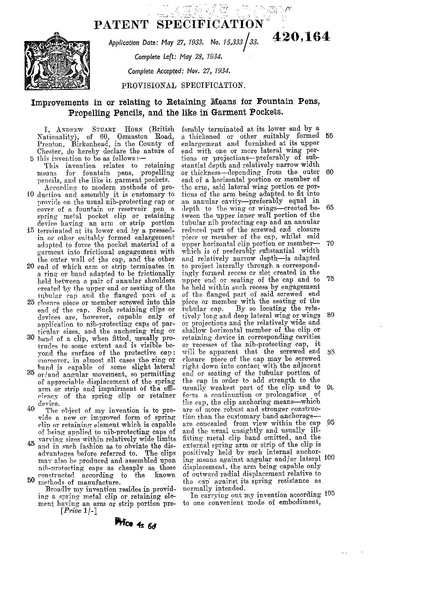 Versione del 11 mar 2017 alle 17:24 di Piccardi (discussione | contributi) ({{PatentInfo |Inventor=Andrew Stuart Horn |Assignee=Andrew Stuart Horn |Country=GB |ApplicationNum=15333/33 |ApplicationDate=1933-05-27 |PatentNum=420164 |PatentDate=1934-11-27 |PriorityDate=1933-05-27 |Marca=Unbranded |Titolo=Improvements in or relati...)