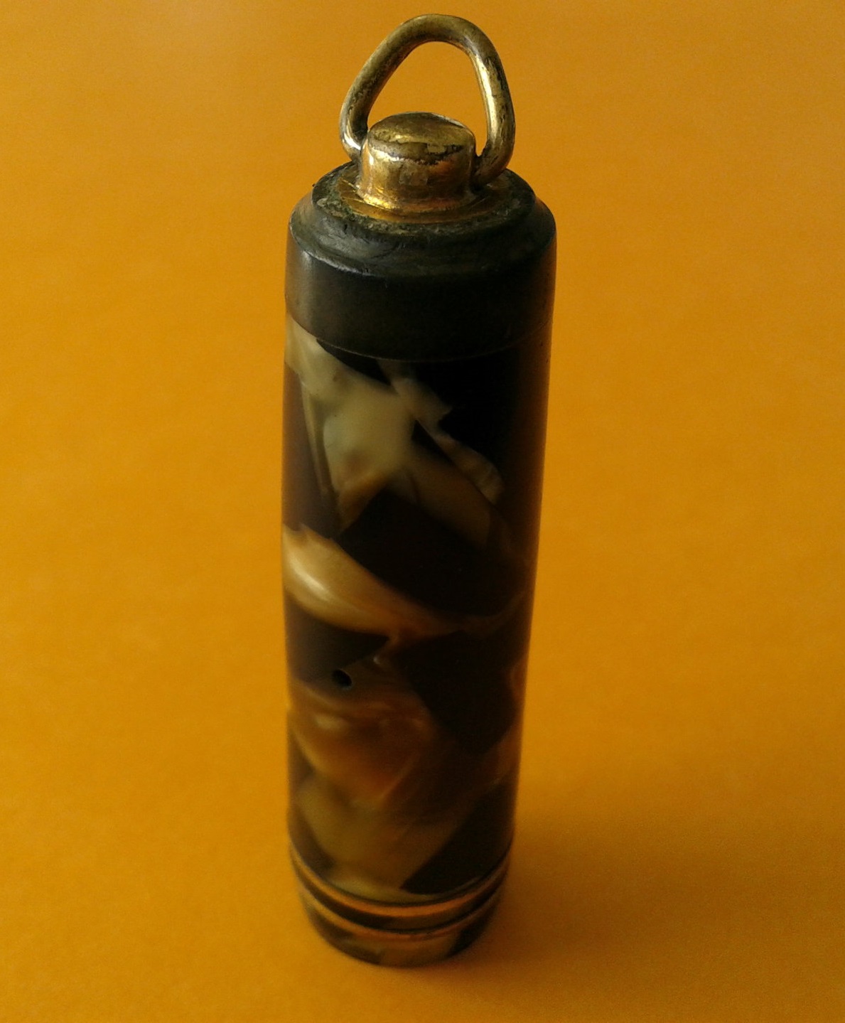 Foto di una penna Standard. Caricamento a pulsante di fondo. Realizzazione in celluloide nera e perla. Dettaglio del cappuccio. Modello da signora non identificato. Contributo di Giorgio (utente forum Musicus).