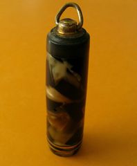 Photo of a pen produced by Standard. Filling system: button filler. In black and pearl celluloid. Detail of cap. Unidentified lady model.